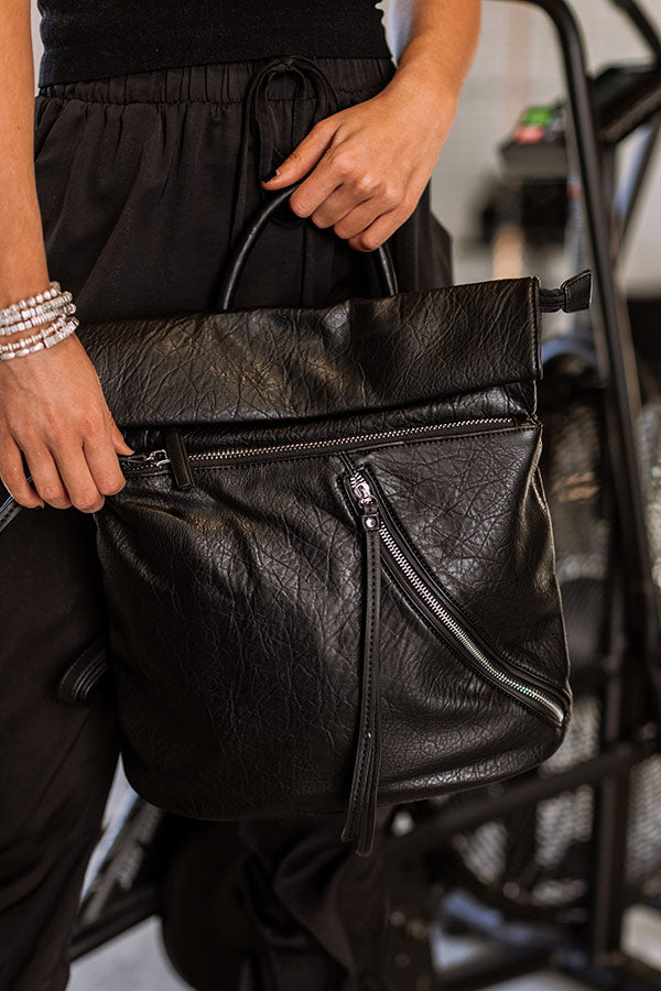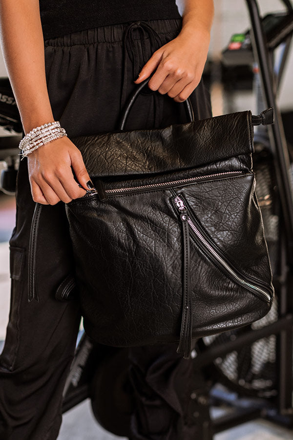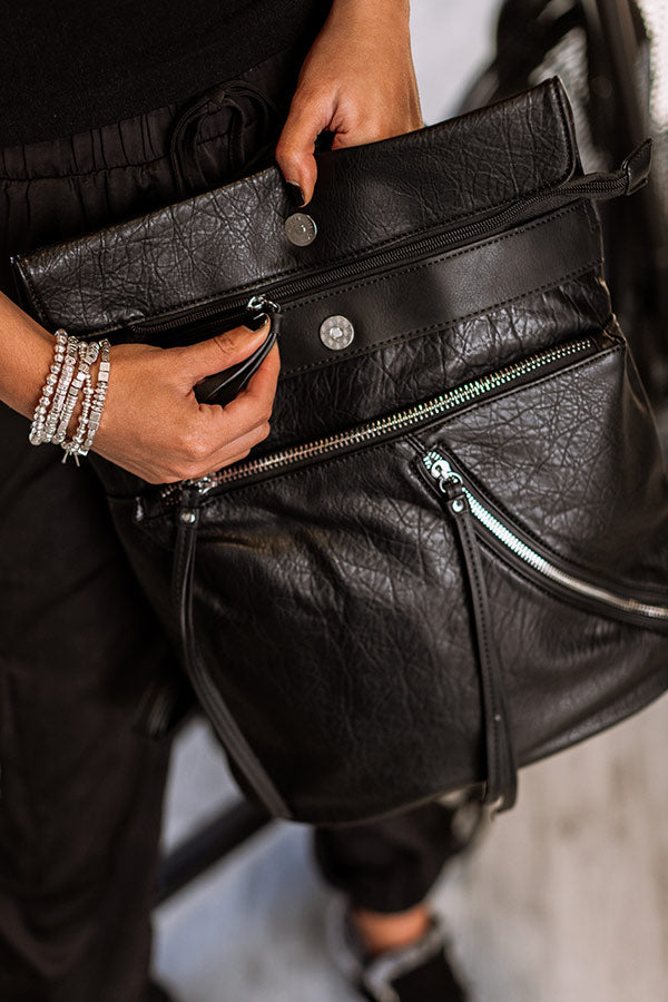 When you're up for an adventure, complete your look with this chic black backpack featuring sleek lightweight faux leather material, an accent diagonal zipper across the front, a single handle, two adjustable shoulder straps, and a spacious fully lined pouch with a zip and snap button closure and additional inside pockets!
