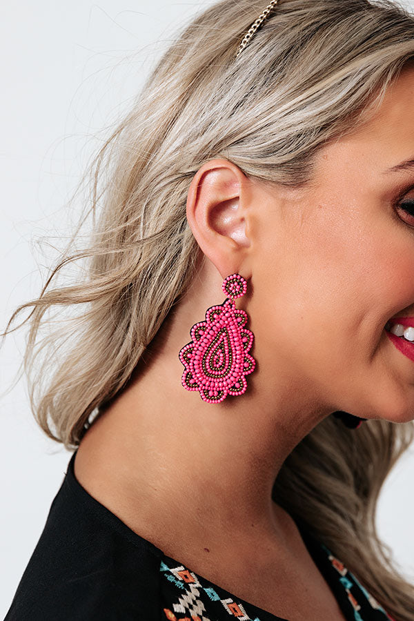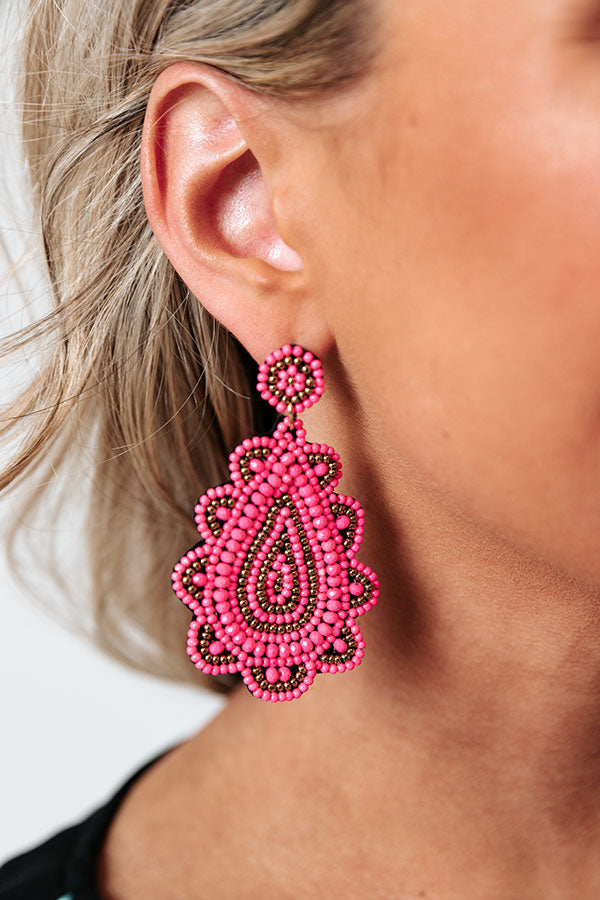 Shine bright in our stunning 'Up In Lights' statement earrings featuring neon pink and gold beaded circle studs and large dangling neon pink and gold beaded scalloped teardrop pendants!