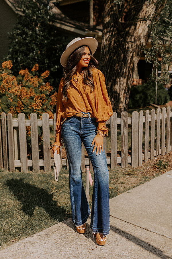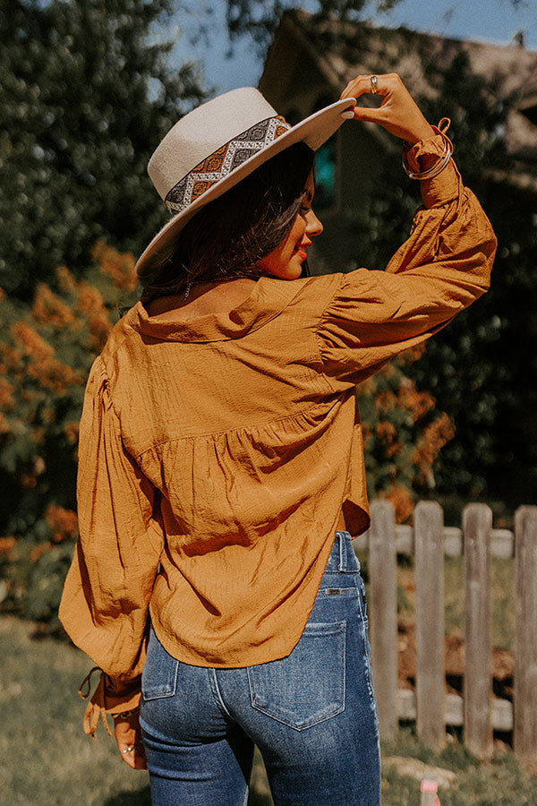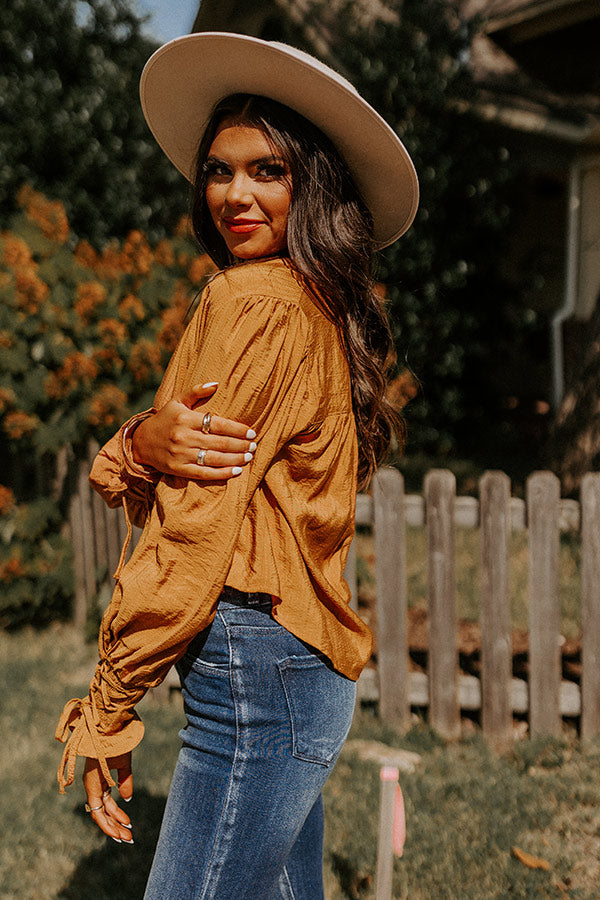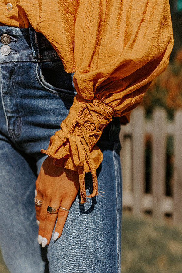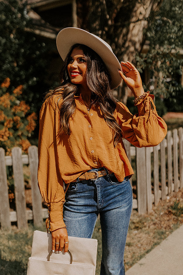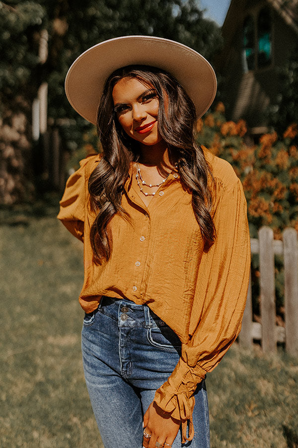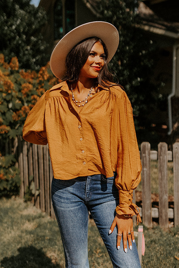 Welcome fall in style in our adorable camel hued 'Upbeat Days' top featuring lightweight material, a button up front with a collared neckline, long bishop sleeves with fitted lace-up cuffs, and a relaxed silhouette that falls into a straight hemline!