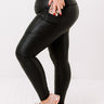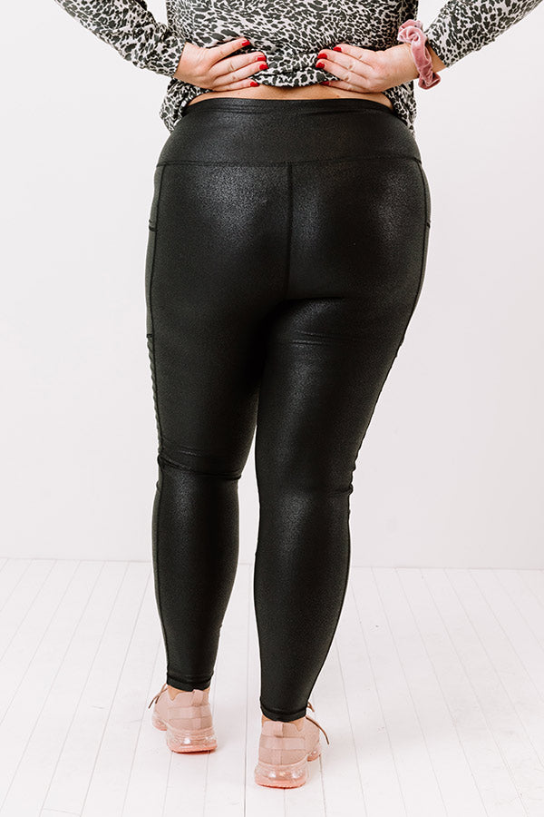 Plus Size - Channel all your upbeat energy with these black active leggings featuring sleek lightweight four-way stretch material, a high waistline for tummy control, accent side pockets, ribbed detailing around the knees, and a flattering figure hugging silhouette that ends in straight ankle-length hemlines! Measurements