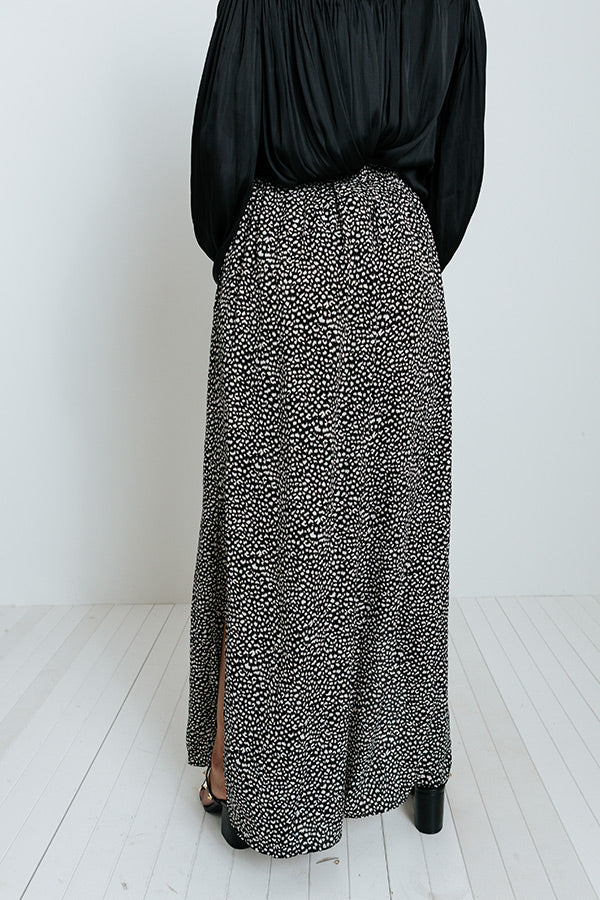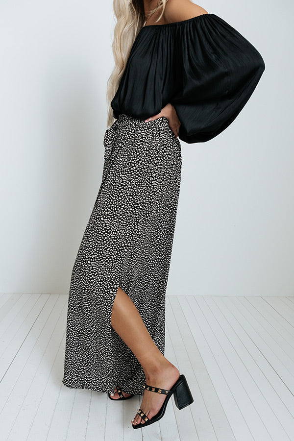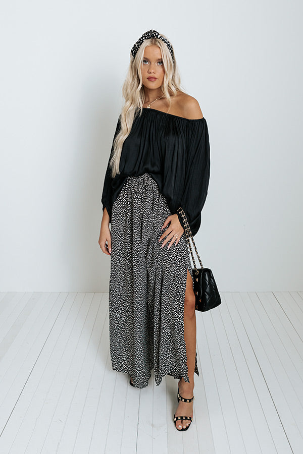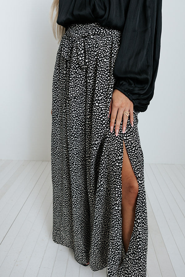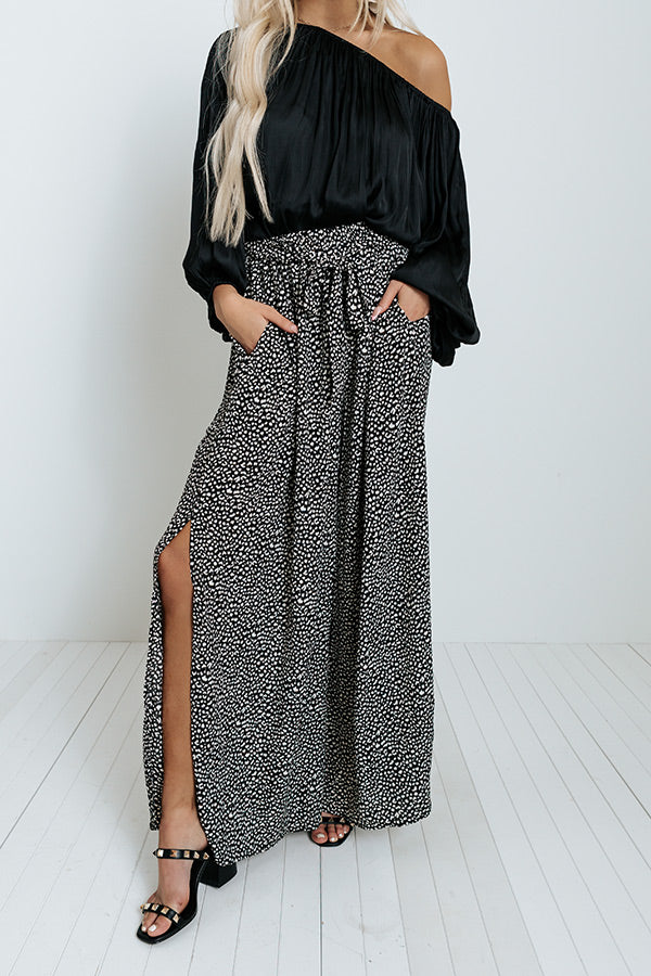Arrive at the office looking chic in our flattering black 'Upbeat Playlist' pants featuring lightweight and breezy material patterned with a small white spotted print, a high elastic waistline with a tie belt, hidden side pockets, and an ultra relaxed silhouette that cascades into straight ankle-length hemlines with accent side slits! Measurements