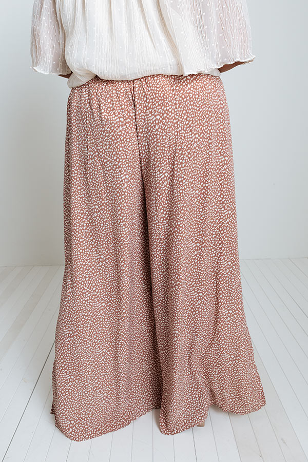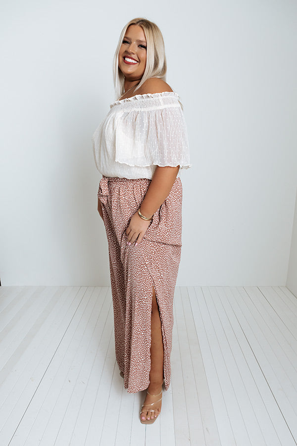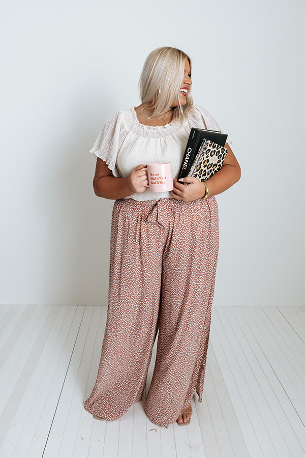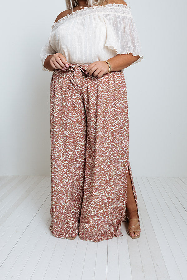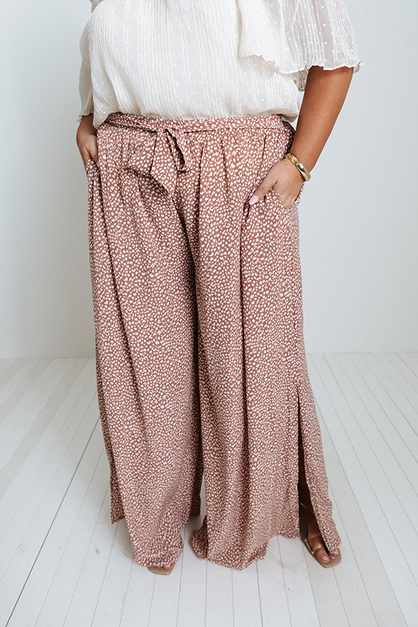 Arrive at the office looking chic in our flattering plus size blush colored 'Upbeat Playlist' pants featuring lightweight and breezy material patterned with a small white spotted print, a high elastic waistline with a tie belt, hidden side pockets, and an ultra relaxed silhouette that cascades into straight ankle-length hemlines with accent side slits! Measurements