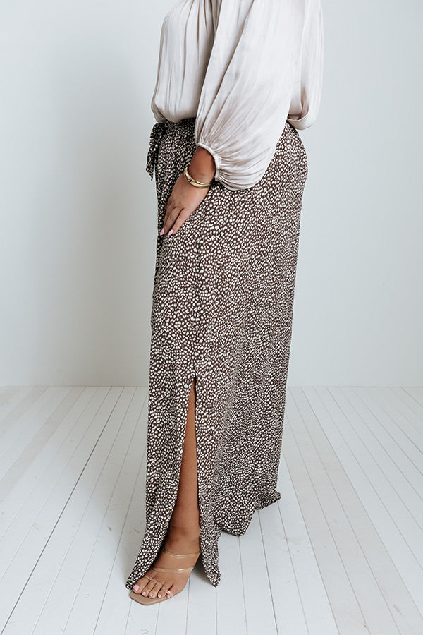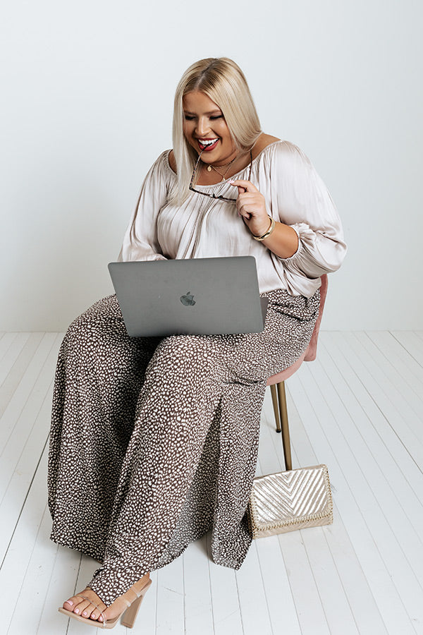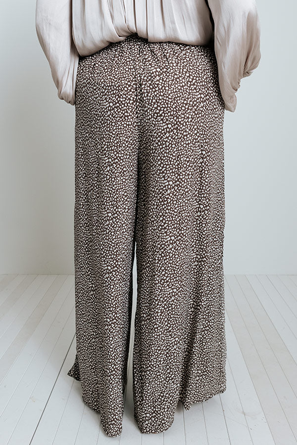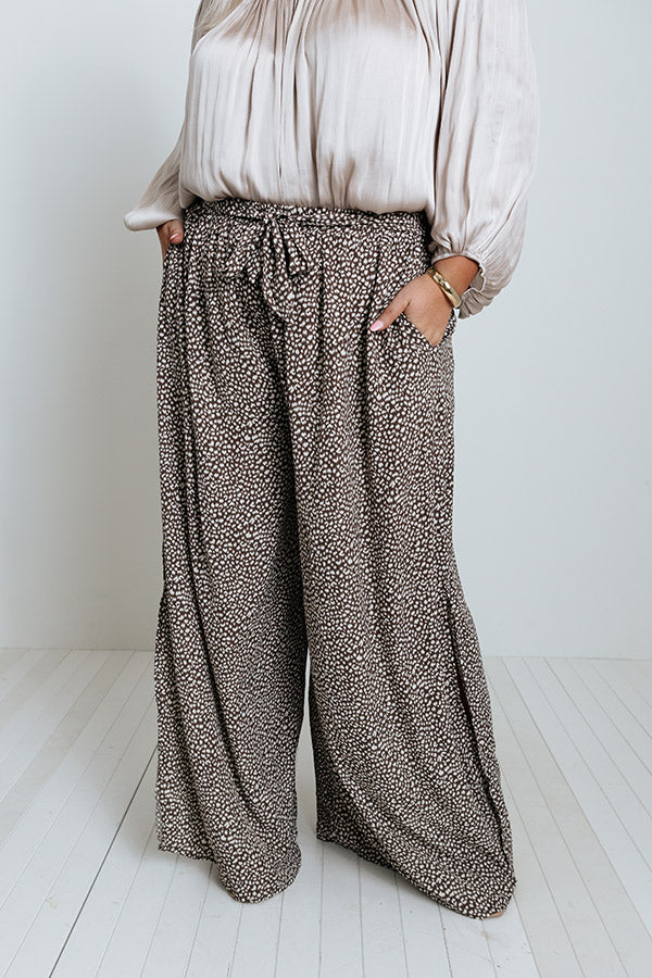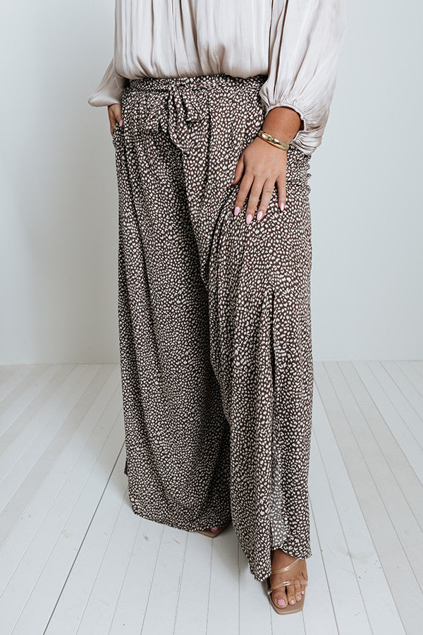 Arrive at the office looking chic in our flattering plus size mocha colored 'Upbeat Playlist' pants featuring lightweight and breezy material patterned with a small white spotted print, a high elastic waistline with a tie belt, hidden side pockets, and an ultra relaxed silhouette that cascades into straight ankle-length hemlines with accent side slits! Measurements