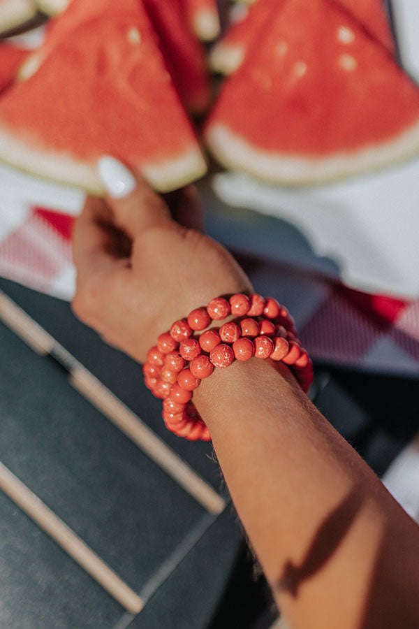 Add an upbeat touch to any look with this stylish bracelet featuring a stretchy silhouette with semi precious scarlet beads!