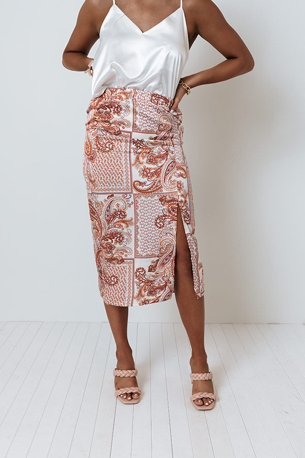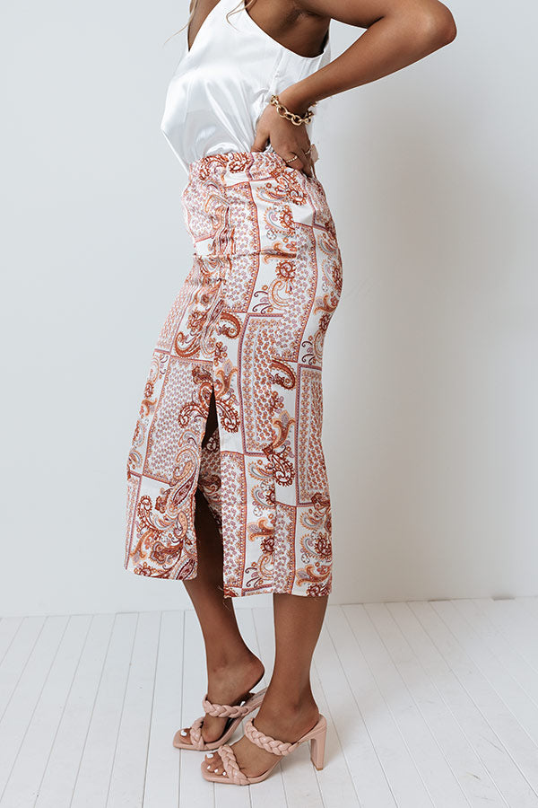 We have no doubt you will fall in love with this gorgeous skirt featuring lightweight satin material patterned with a pretty pink hued baroque print, an elastic waistline, and a flattering figure hugging silhouette that ends in a straight mid-calf length hemline with an accent slit!