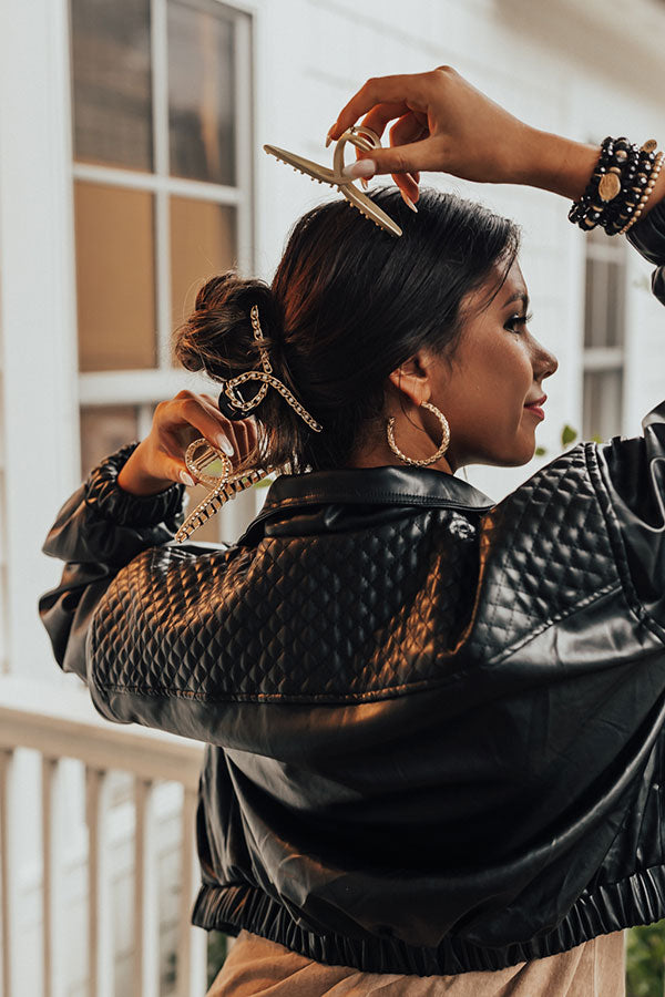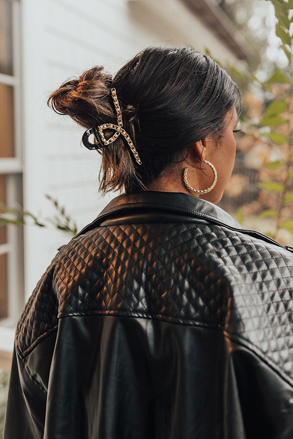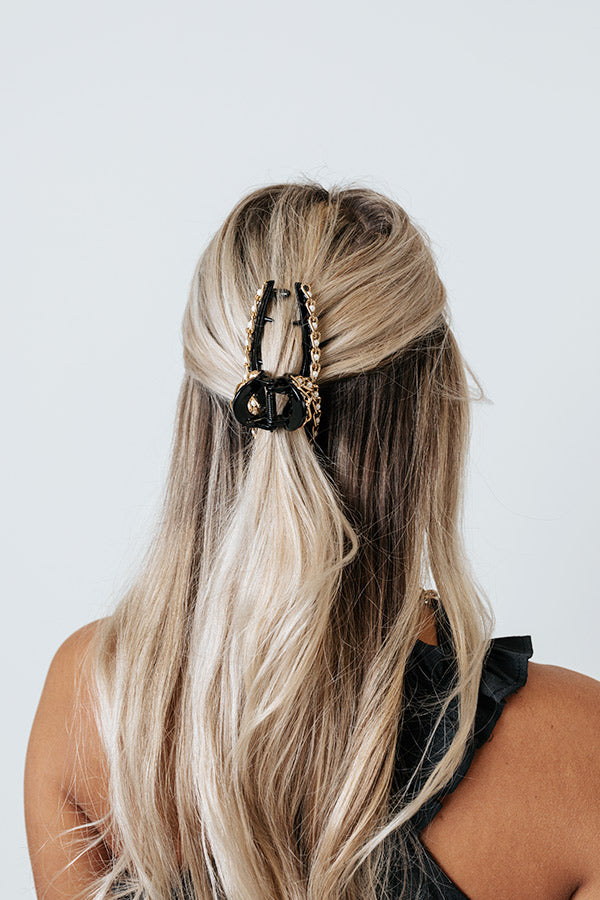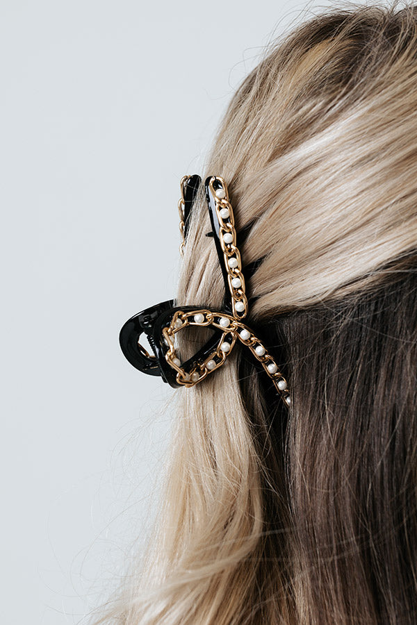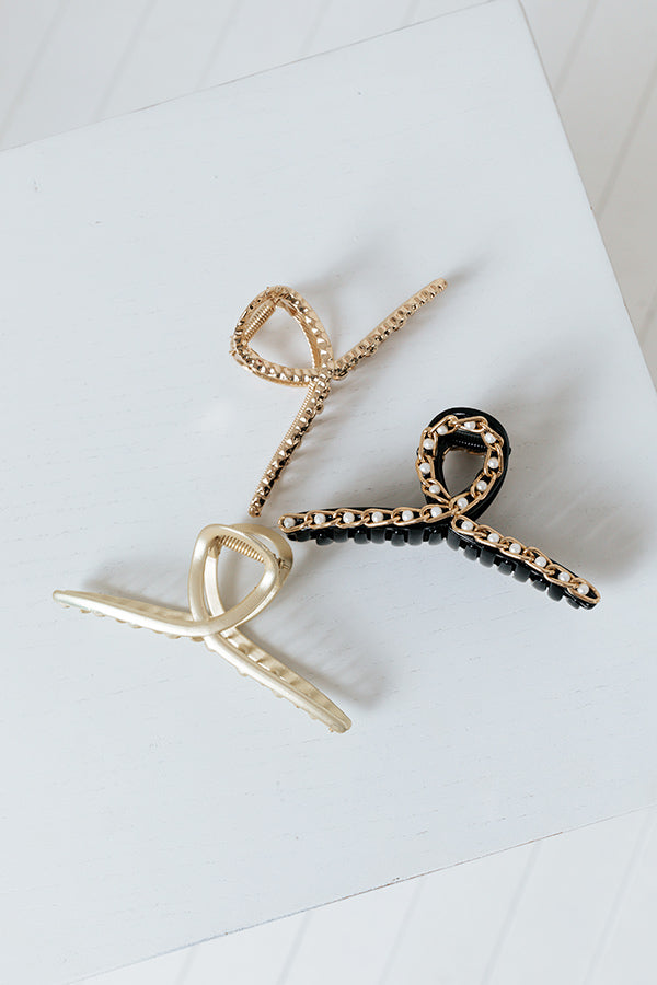 Glam up your hairstyle with our chic 'Upper West Side Hair Claw Clip Set' featuring three pieces: a black looped one with a peal gold link chain accent, a pearl looped one, and a gold looped one with pearl accents!
