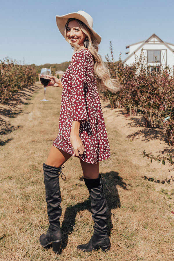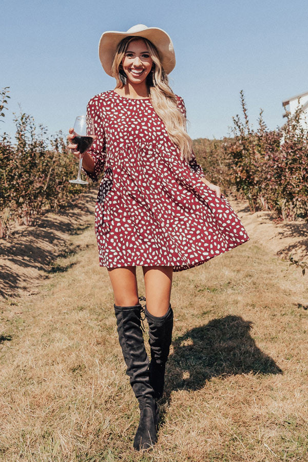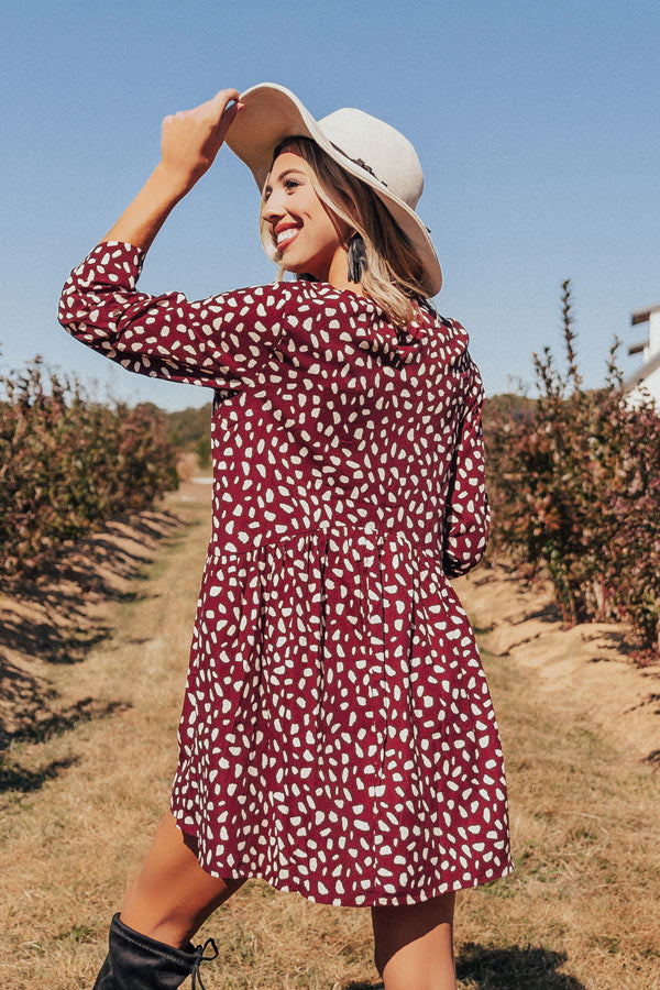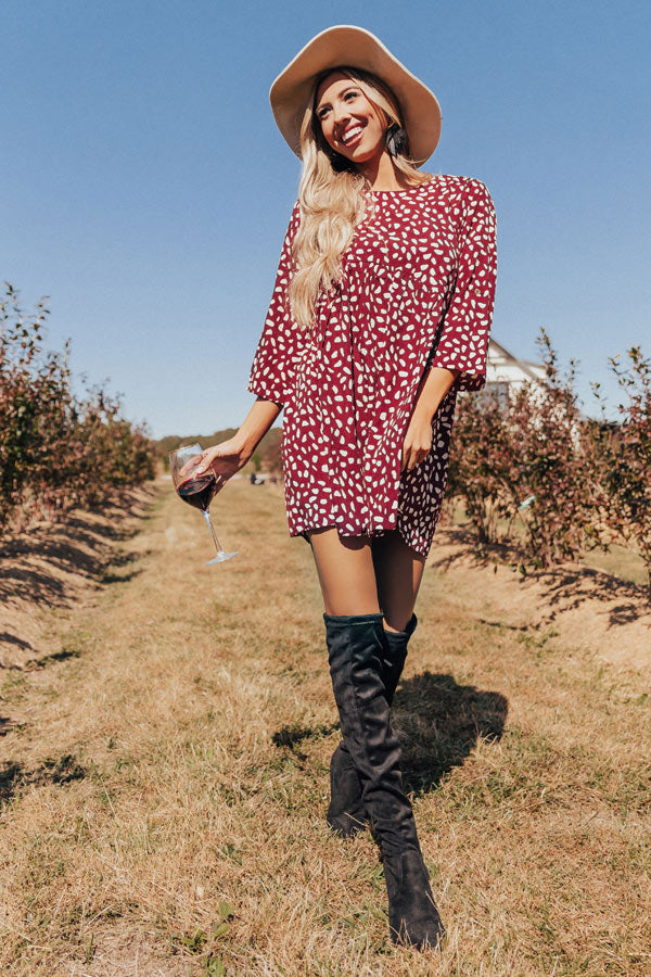 You won't find a more fashionable piece to wear on your "upstate adventures" than this maroon colored dress featuring lightweight material with a white spotted pattern, a high rounded neckline, a keyhole accented upper back with a button closure, loose half sleeves, and a relaxed babydoll fit silhouette that falls into an uneven mid-thigh length hemline! We have styled this gorgeous fall essential with some black over the knee boots and a neutral faux suede hat, but you can also wear it with "The Jess Faux Suede Heel in Natural" and our "Set For Success Quilted Crossbody in White!" Measurements