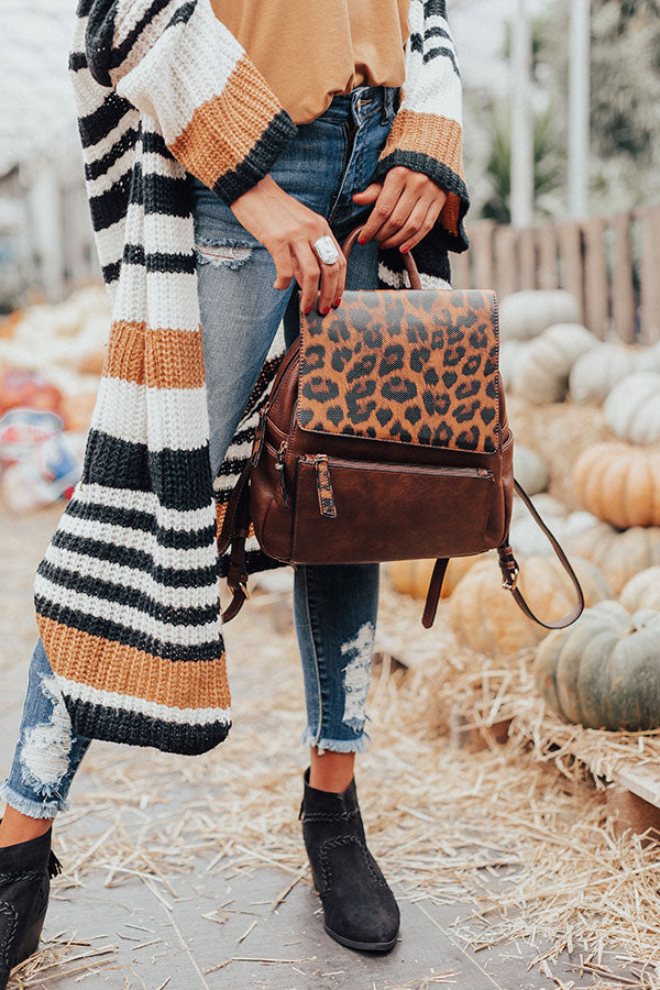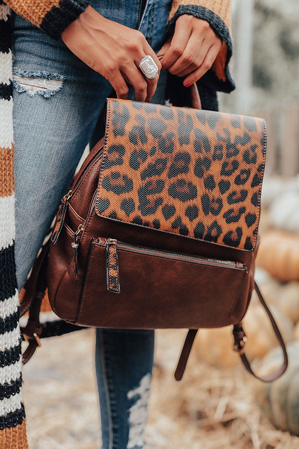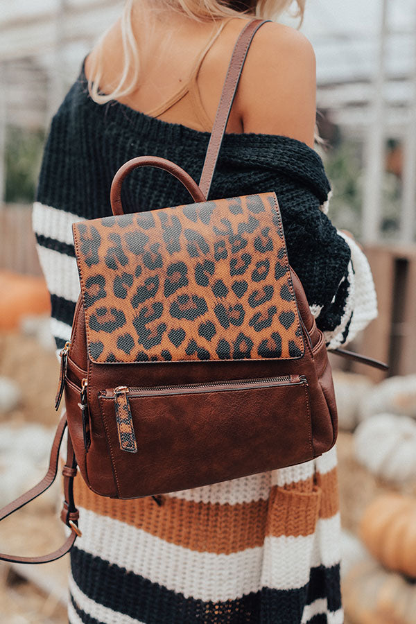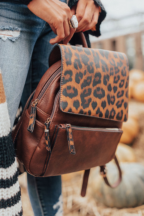 There is no better accessory to carry on your "upstate adventures" than this brown backpack featuring faux leather material, a leopard accent flap, two adjustable shoulder straps, one tote handle, and a spacious fully lined pouch with a zip closure and additional inside pockets!