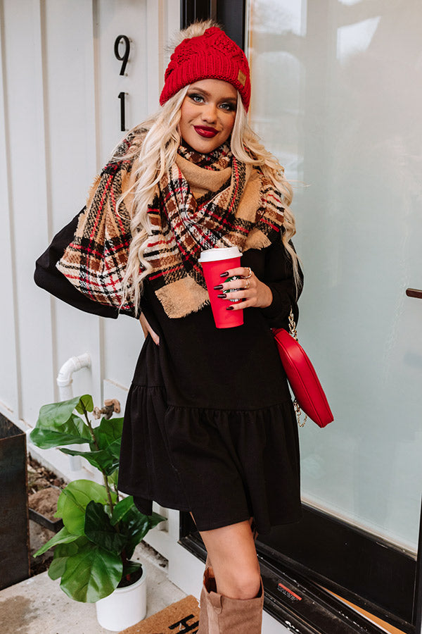 You are guaranteed to be cozy when you wrap up in this adorable tan blanket scarf featuring soft lightweight but warm tight knit material patterned with a red, black, and white plaid print and frayed trim detailing!