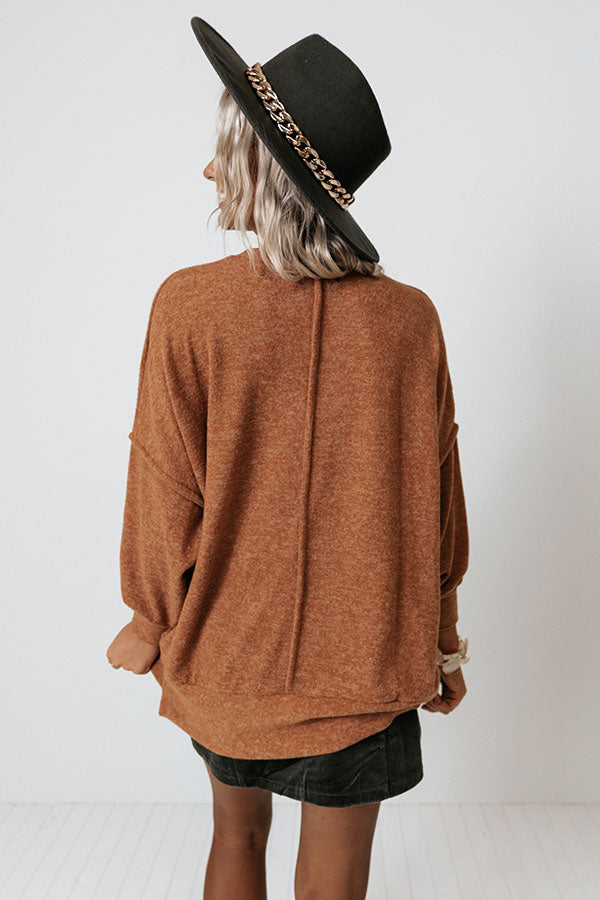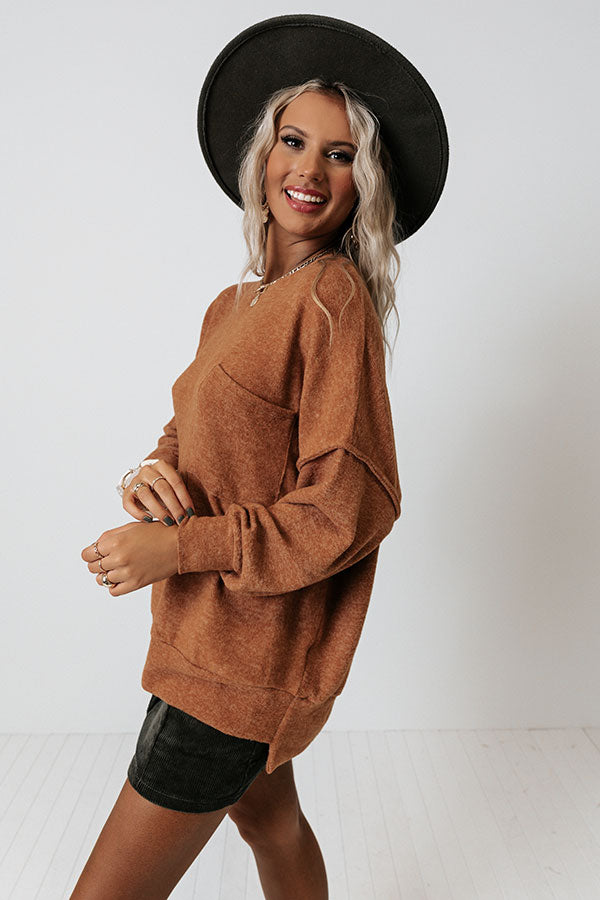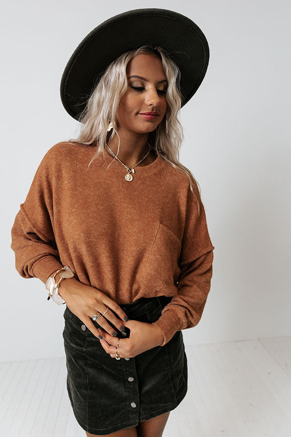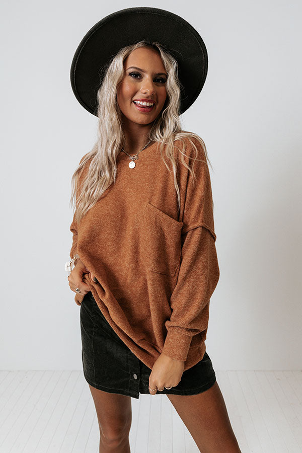 Stay cozy in this camel colored upscale shift sweater featuring soft lightweight material, a high rounded neckline, a single accent chest pocket, long loose sleeves with fitted cuffs, and an ultra slouched silhouette that falls into a straight tunic-length hemline! Measurements
