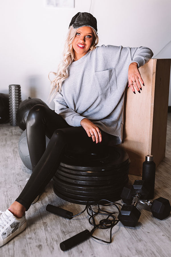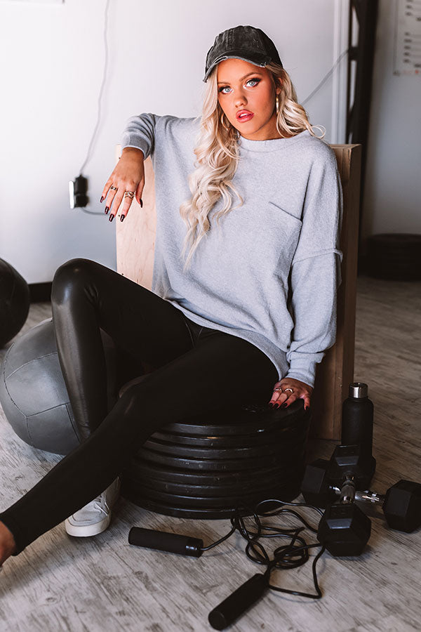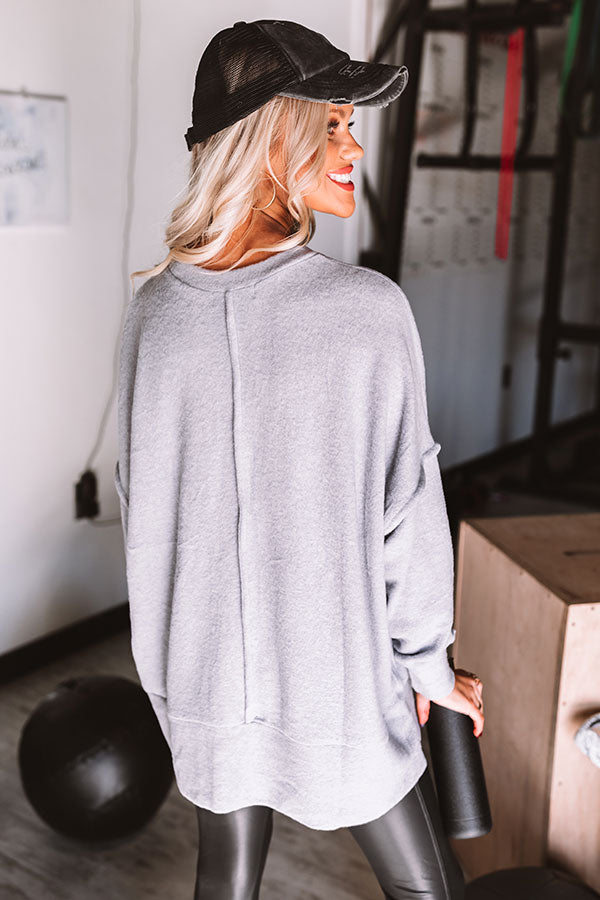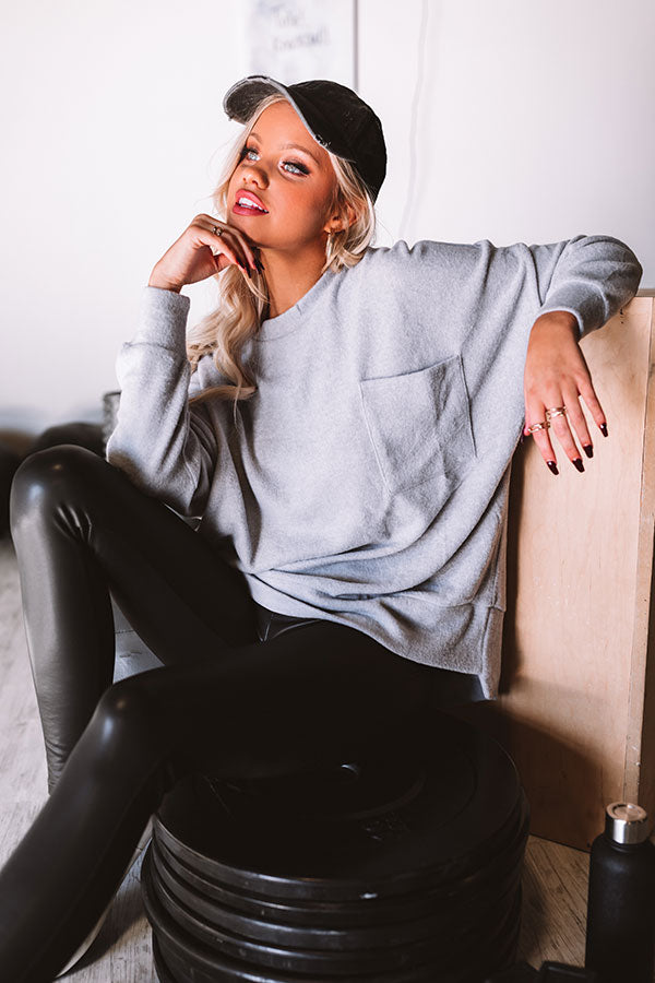 Stay cozy in this grey upscale shift sweater featuring soft lightweight material, a high rounded neckline, a single accent chest pocket, long loose sleeves with fitted cuffs, and an ultra slouched silhouette that falls into a straight tunic-length hemline! Measurements