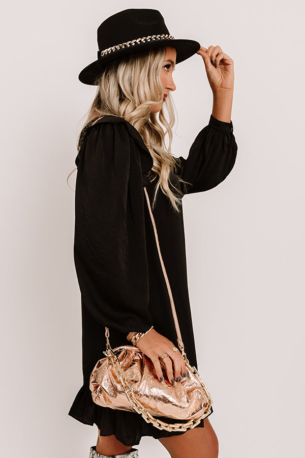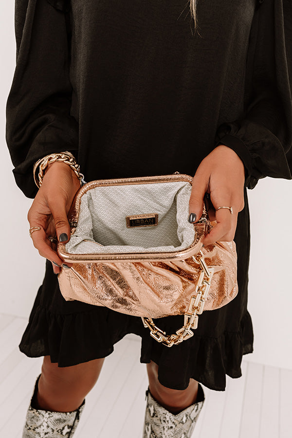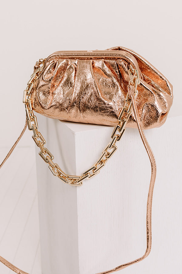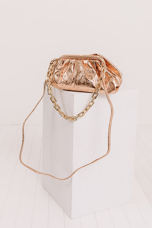 You are guaranteed to arrive in style when you accessorize with this striking gold crossbody featuring sleek material, a removable chain handle, an adjustable shoulder strap, and a spacious lightweight pouch with additional inside pockets!