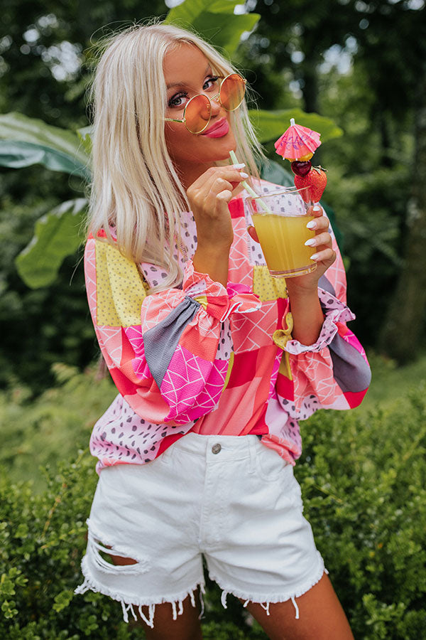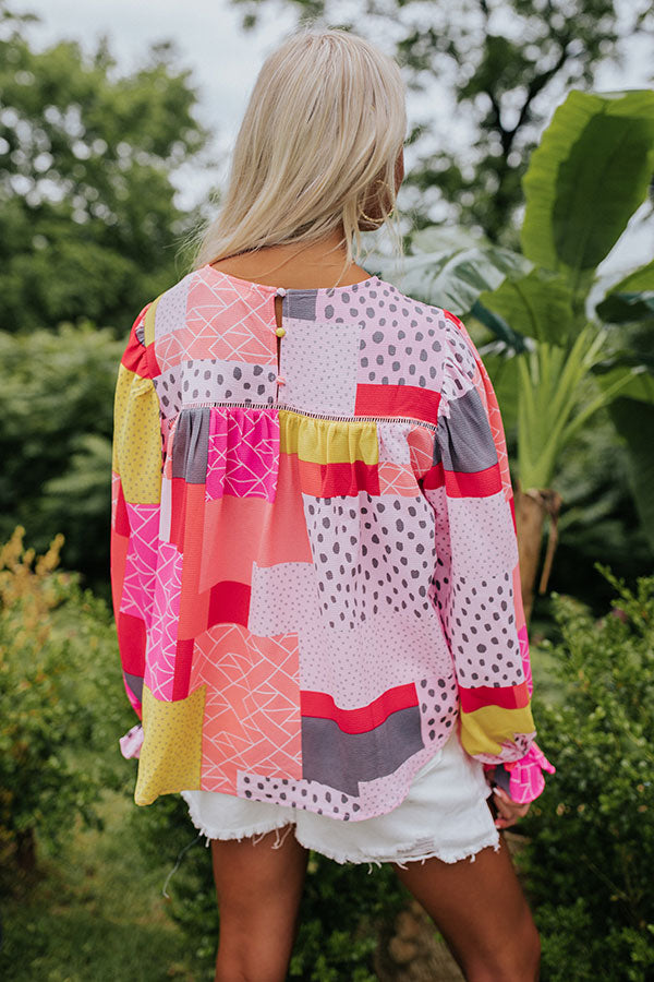 Charm your way through summer in this unique shift top featuring lightweight material patterned with a variety of colorful printed patchwork panels, a rounded neckline, long bishop sleeves with flared cuffs, a keyhole accented upper back with a three button closure, and a relaxed silhouette that falls into a straight hemline! Measurements