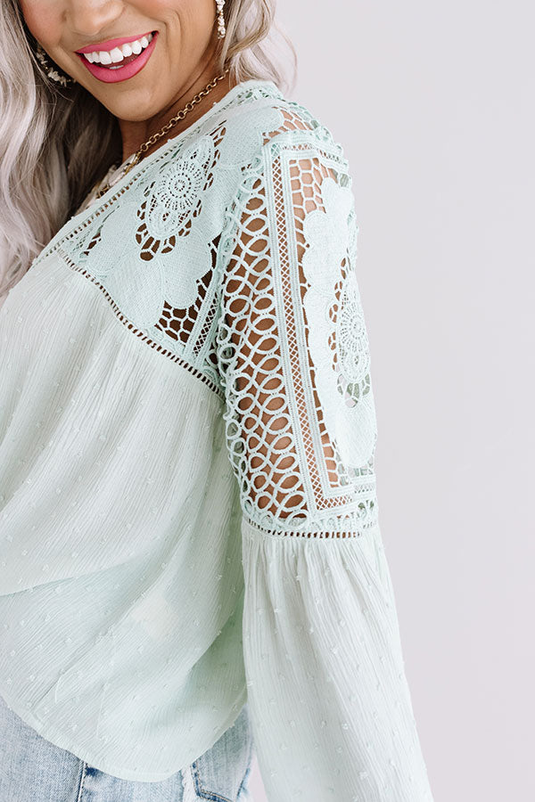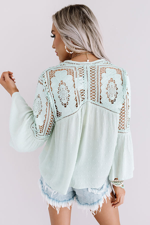 All your "uptown dreams" are sure to come true when you wear this chic mint colored top featuring lightweight material, intricate semi-sheer crochet detailing across the upper back and on the shoulders and upper arms, a button up bodice with a deep v-cut neckline, long loose sleeves with flared cuffs, and a relaxed silhouette that falls into a knotted front hemline! We have styled this unique piece with some frayed denim shorts, a statement necklace, and a white bootie and crossbody, but you can also wear it with some distressed white skinnies, "The Melina Heel in Latte," and our "All Caught Up Headband in Khaki!"