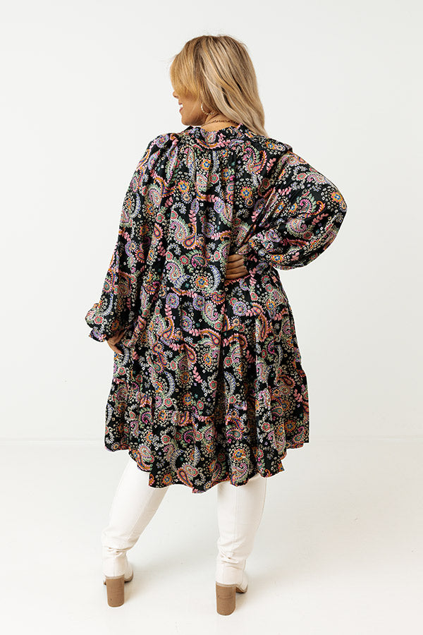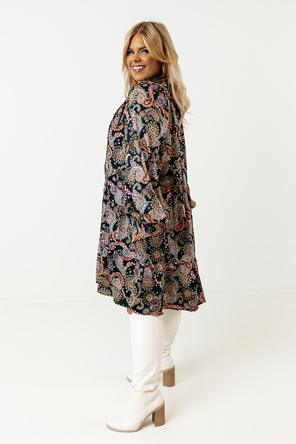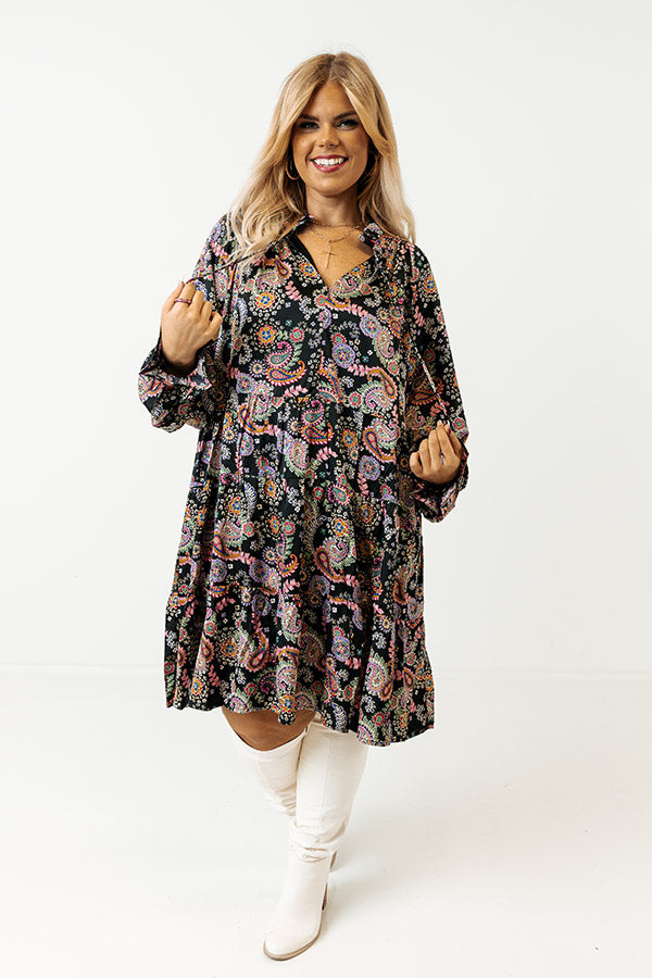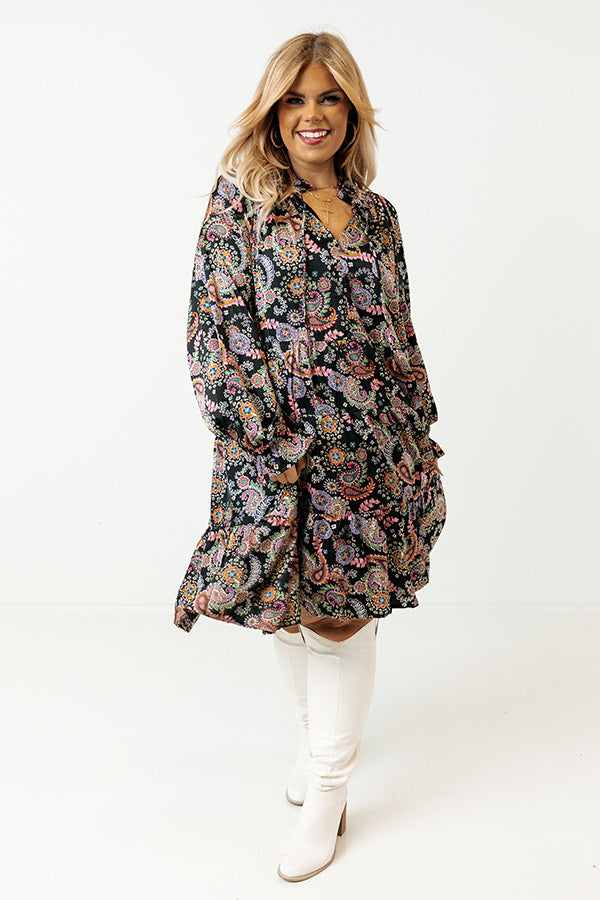 Be date night ready in this black and multicolored paisley shift dress featuring a lightweight material, V-neck front tie closer with ruffle collar detail, long loose fitting sleeves with elastic cuffed ruffle, and a flowy silhouette that falls into a straight mid-thigh length hemline.