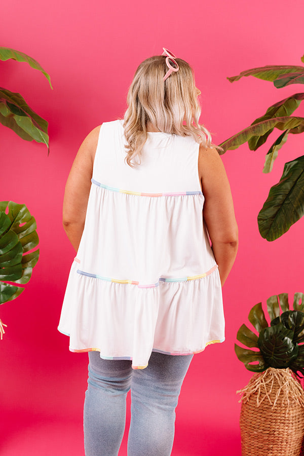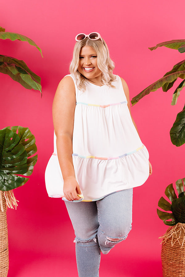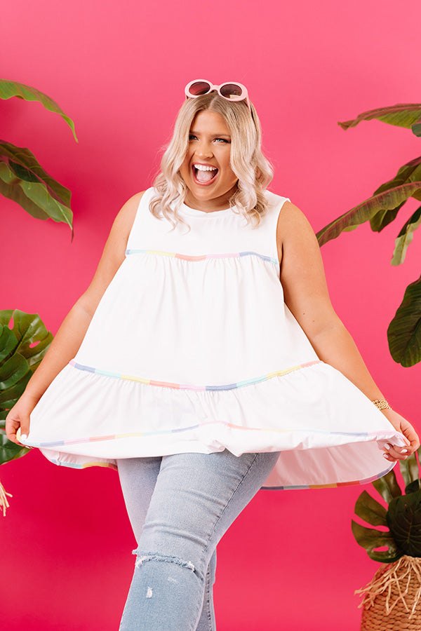 Plus Size - Twirl from season to season in style with this adorable white top featuring soft lightweight material with horizontal colorful accent stripes, a high rounded neckline, wide 3-inch sleeveless shoulder straps, and an ultra relaxed tiered silhouette that falls into an uneven hemline! We have styled this cutie with some light wash flares and a brown mule heel and faux leather bucket bag, but you can also wear it with some frayed shorts, "The Bowen Wedge in Blue," and our "Style Session Headband in White!" Measurements