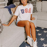 - Unlined material with a red and navy blue 'USA' graphic design on the front