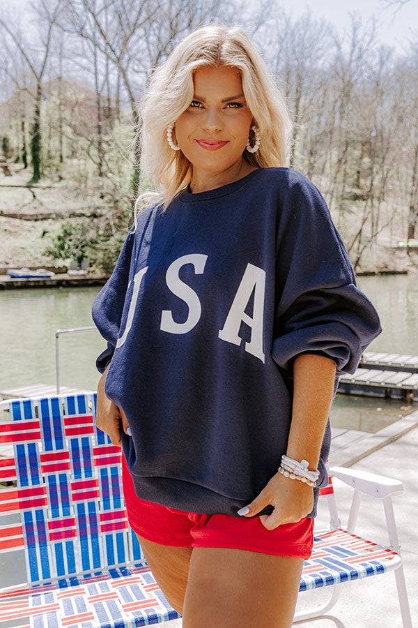 Keep war on those chilly summer nights with this cute plus size navy sweatshirt featuring soft material with white USA letters across the front, a rounded neckline, long loose sleeves with fitted cuffs, and a slouched silhouette that ends in a straight hemline! on products Measurements