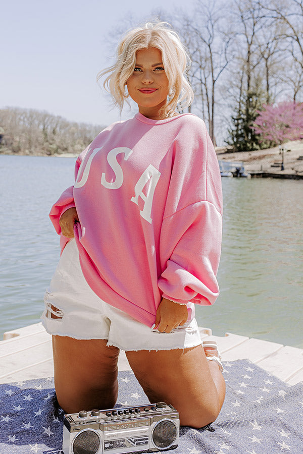 Keep war on those chilly summer nights with this cute plus size pink sweatshirt featuring soft material with white USA letters across the front, a rounded neckline, long loose sleeves with fitted cuffs, and a slouched silhouette that ends in a straight hemline! on products