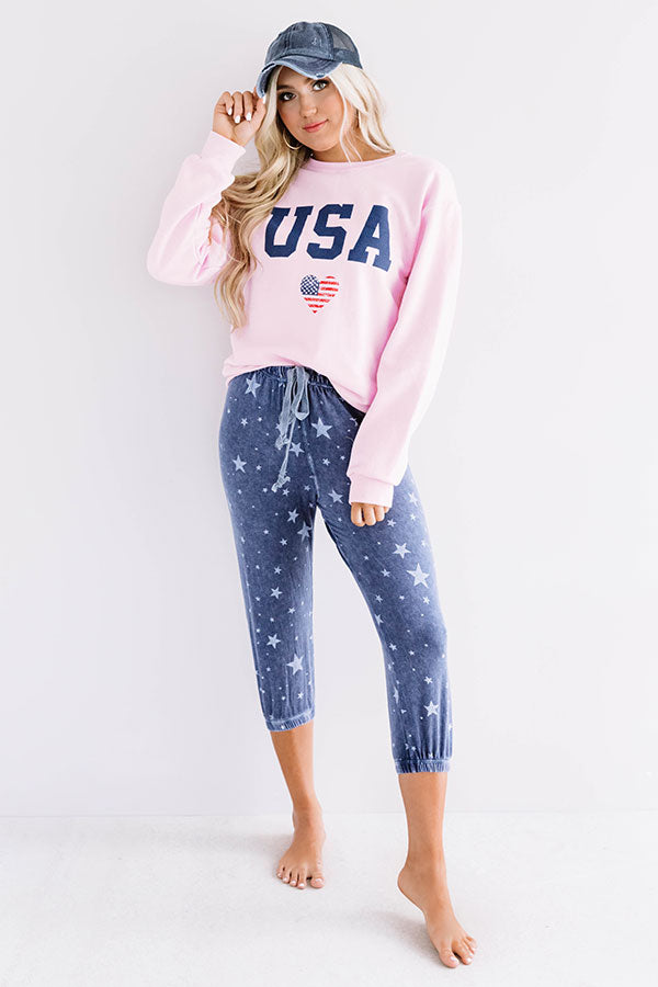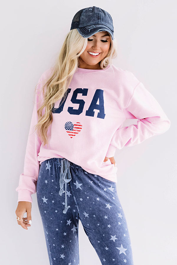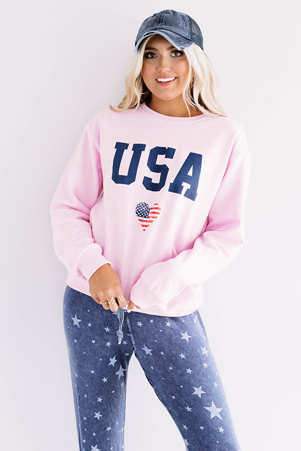 Let your patriotic side show with our adorable pink "USA Sweetheart Sweatshirt" featuring soft lightweight material with large block lettering on the front and an American flag heart, a high rounded neckline, long loose sleeves with fitted cuffs, and a relaxed silhouette that falls into a straight hemline! We have styled this cutie with some matching star joggers and a navy baseball cap, but you can also wear it with some distressed denim shorts, "The Lyndley Faux Leather Sandal in Red," and our "Bryant Park Views Quilted Crossbody in Red!" Measurements