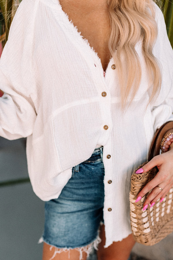 There is no better piece to take on vacation than this casual white shift top featuring lightweight material, a button down front, long loose sleeves with button closure cuffs, low accent pockets, and a relaxed silhouette that falls into a rounded tunic-length hemline!