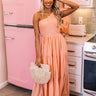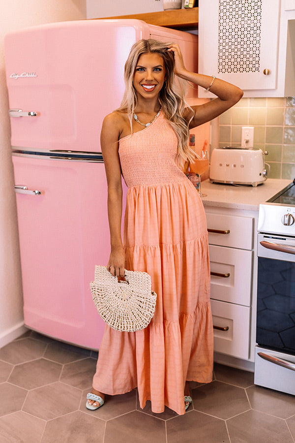 There is no better piece to pack for a summer vacation than this pretty peach colored maxi dress featuring lightweight material, a fitted smocked bodice with single wide shoulder strap and a diagonal neckline, and a relaxed tiered skirt silhouette that cascades into a straight ankle-length hemline!