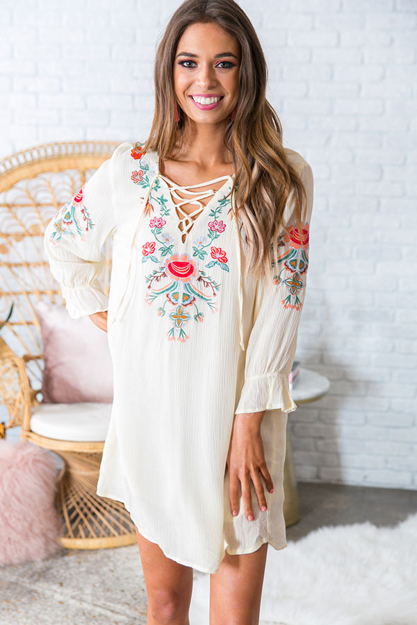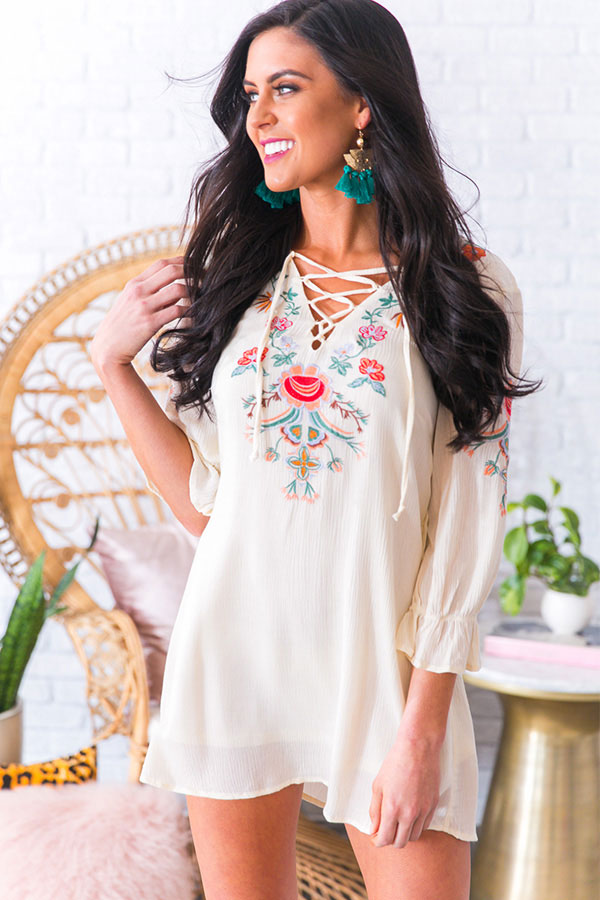 Vacay like it's your job in this adorable shift dress! This quarter-sleeve cutie has a lace-up embroidered neckline & a breezy shift bodice that's giving us major boho vibes. You'll feel like you are always on vacation in this gorgeous babe!