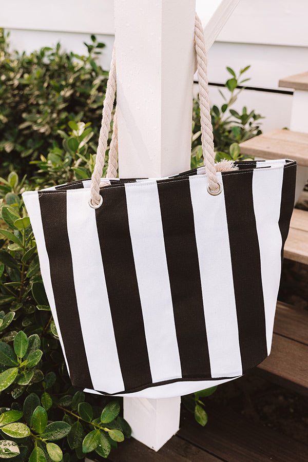 There is no better bag to carry when you are "vacay bound" than this adorable tote featuring lightweight canvas material patterned with wide black and white vertical stripes, two twisted rope handles, and a spacious pouch!