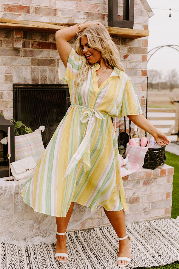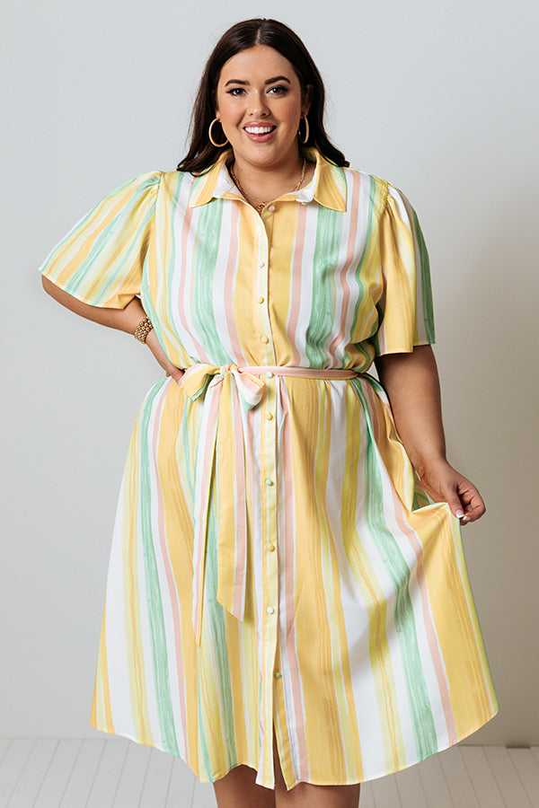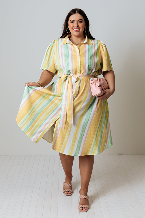 Plus Size - Get ready for vacay with this gorgeous summertime dress featuring lightweight flowy material patterned with vertical pastel rainbow accent stripes, a button down front with a collared neckline, short loose sleeves, a tie belt, and a relaxed silhouette that falls into a straight knee-length hemline!