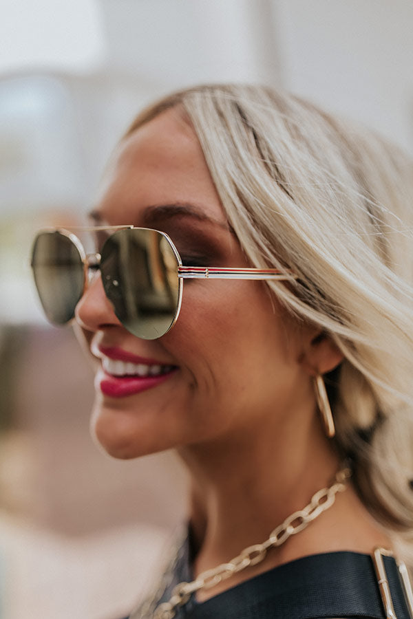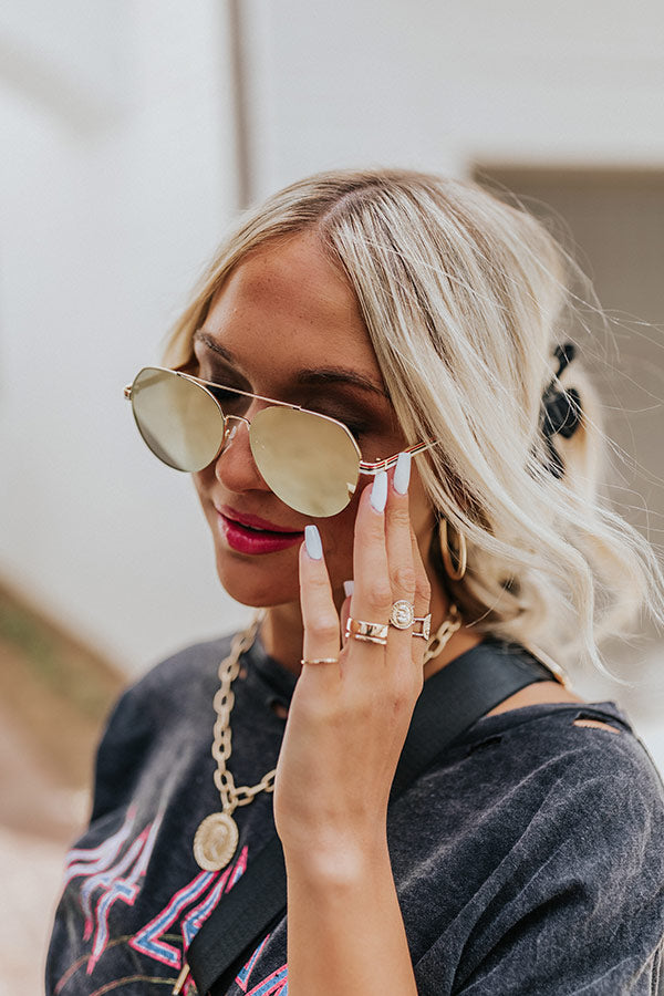 Enter into vacay mode when you slip on these trendy sunnies featuring gold aviator frames and gold tinted lenses!