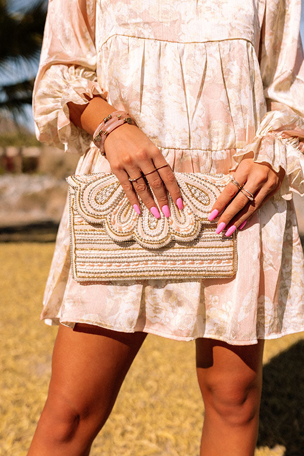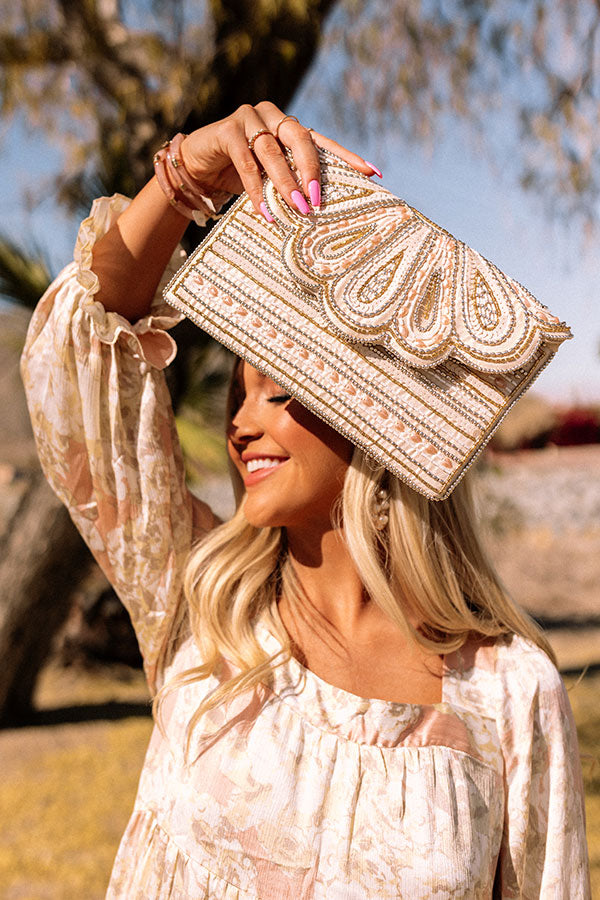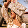 Add a touch of glam to your look with our stunning 'Valet Visit Embellished Clutch' featuring intricate gold and natural beaded detailing, a scalloped envelope flap closure with a snap button, a removable chain link shoulder strap, and a fully lined interior with an additional inside pocket!