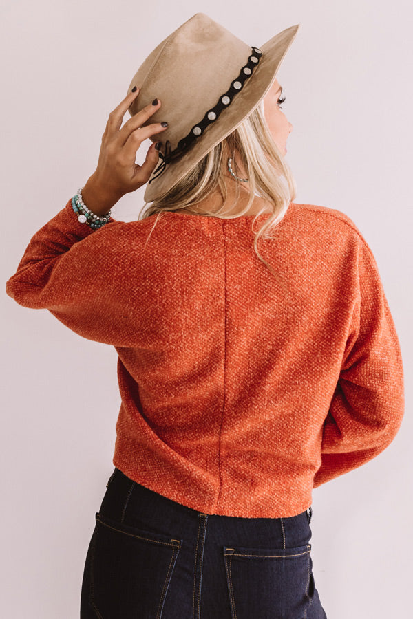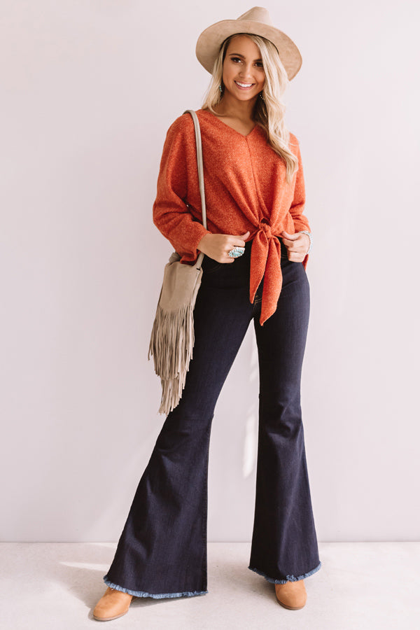 You are sure to look like a total "valley babe" when you wear this pumpkin colored top featuring a lightweight loose knit material, a v-cut neckline, long loose sleeves, center accent seams, and a relaxed bodice that falls into a cropped front tie hemline and a straight back hem! This simple but significant piece can be styled a variety of ways, like with some dark denim flares, turquoise jewelry, booties, and a neutral fringe crossbody and faux suede hat, or with our "Weekend In NYC Ribbed Velour Skirt in Black" and "The Saylie Peep Toe Heel in Black!" Measurements