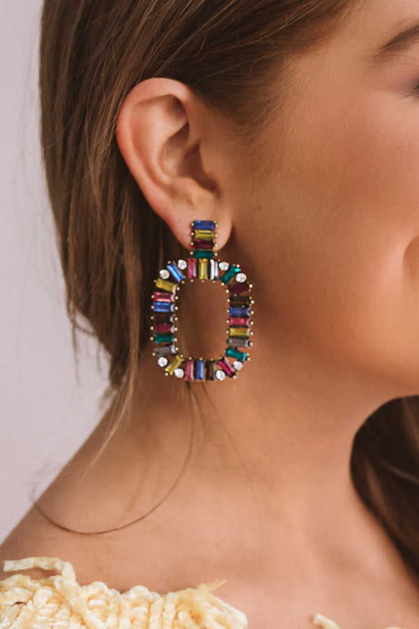 These oversized square hoop earrings shine brighter than the "Vegas lights" with their green multi hued gemstones and diamond spacers inside a gold setting!