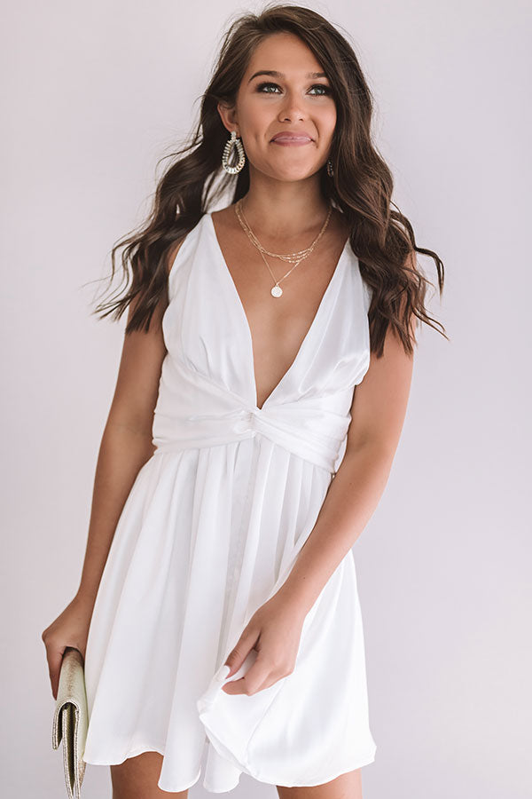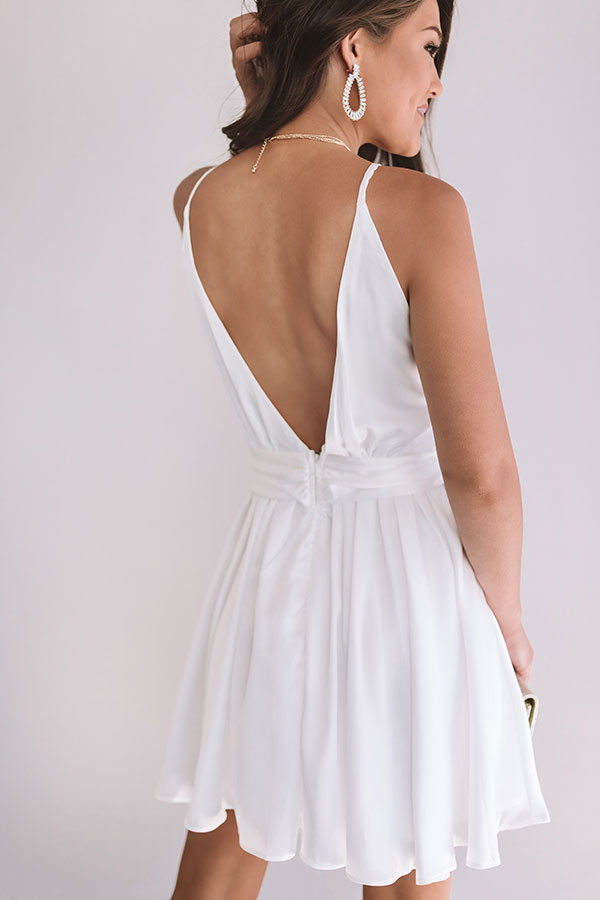 What happens in Vegas stays in Vegas, but your impeccable style doesn't! This white weekend dress features silk fabric, a v-back and v-neck, a zipper in the back, and a twisted waistband! Pair this beautiful piece with some white heels and an elegant clutch for a perfect bachelorette or girls trip look! Measurements