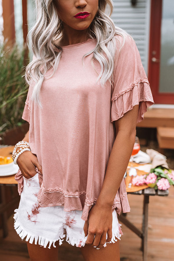 Slay all day in our adorable blush colored "Venice Beach Boardwalk Shift Top" featuring soft lightweight material, a high rounded neckline, short loose sleeves, oversized ruffled trim detailing, a faux wrapped back, and a relaxed silhouette that falls into an uneven hemline! You can style this piece a variety of ways, like with some matching frayed shorts and neutral wedges, or you can wear it with some distressed ankle skinnies, "The Saylie Peep Toe Heel in Blush," matching white sunnies, and our "Glam Expectations Faux Leather Clutch in Pink!" Measurements