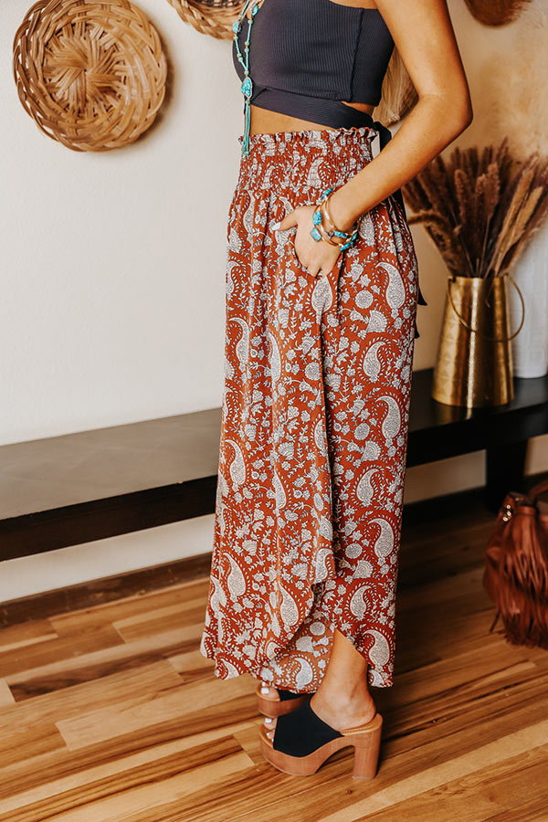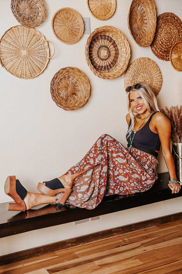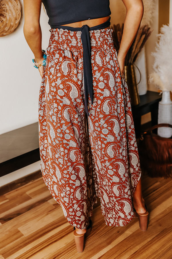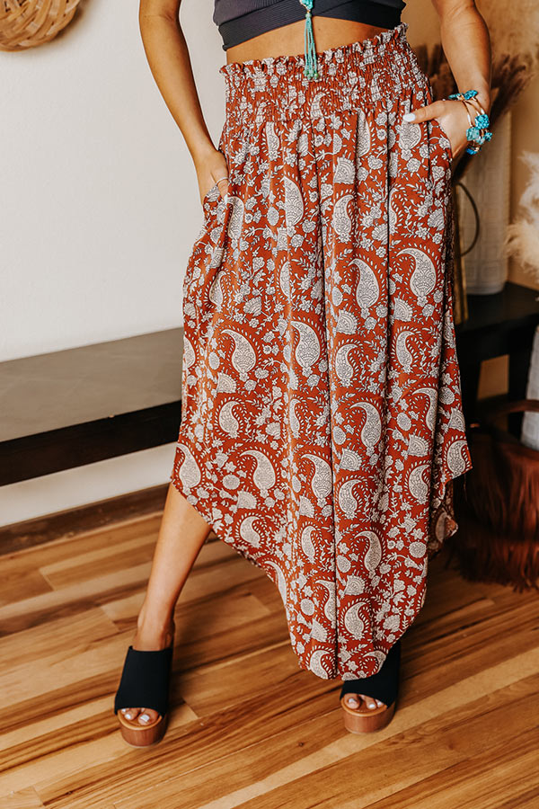 You are sure to turn heads in our adorable dark rust hued 'Venice Boardwalk' pants featuring lightweight breezy material patterned with an intricate black and white paisley print, a wide smocked waistline, accent side pockets, and a slouched silhouette that falls into rounded high/low mid-calf length hemlines! Measurements