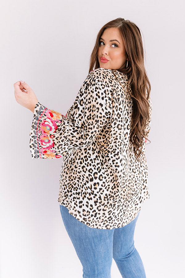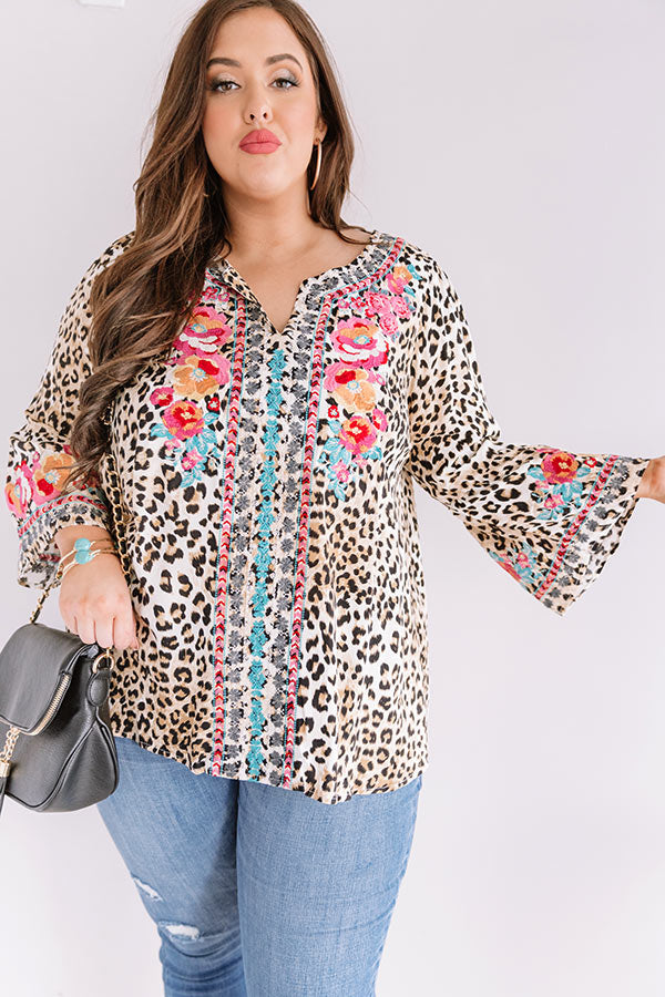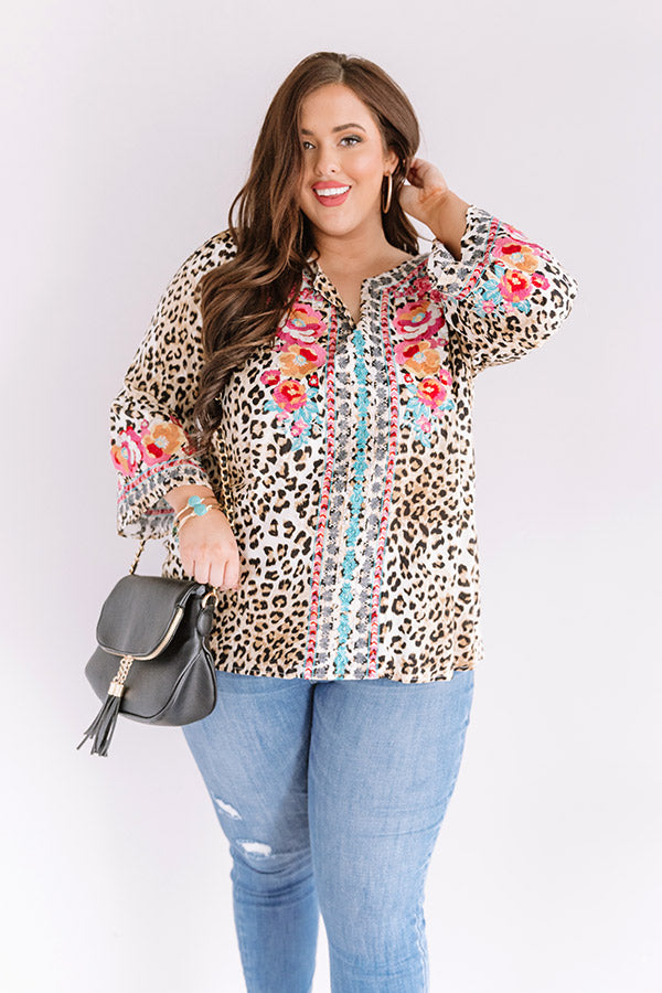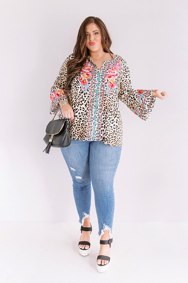 Plus Size - You are sure to turn heads when you wear our unique "Venice Spritzers" top featuring lightweight material patterned with a bold black and neutral hued leopard print and intricate colorful floral embroidery, a high rounded neckline with a v-cut notch, long loose sleeves with flared cuffs, and a relaxed silhouette that falls into a rounded hemline! We have styled this eye-catching piece with some light wash skinnies and a black wedge and crossbody, but you can also wear it with some black shorts, "The Ariella Heel in Hot Pink," and our "Serving Up Chic Headband in Ocean Blue!" Measurements