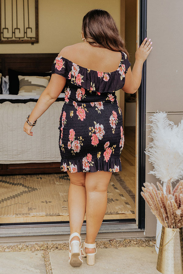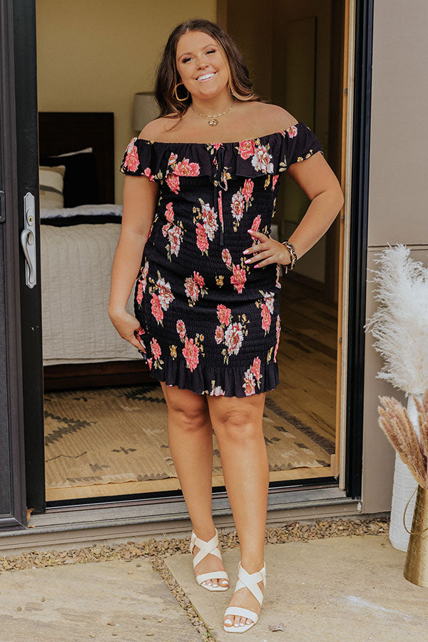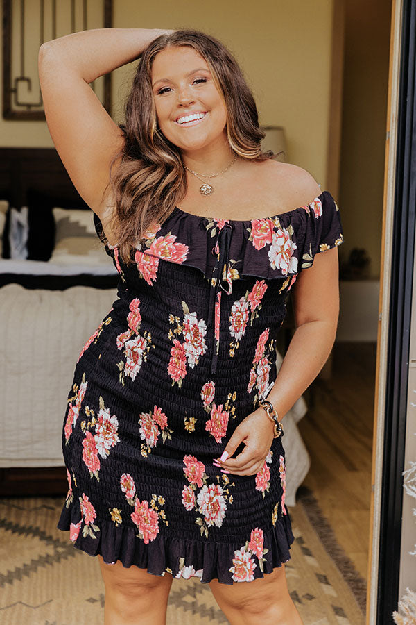Plus Size - Wow the crowd in our beautiful black 'Ventura Highway' dress featuring lightweight four-way stretch smocked material patterned with a bold fuchsia hued floral print, an off shoulder neckline with a front tie detail, an overlay bodice with short drop sleeves, and a flattering figure hugging silhouette that ends in a ruffled mid-thigh length hemline!