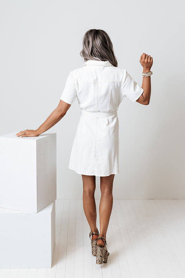 Take on any day or occasion in our upscale white 'Veranda Kisses' dress featuring lightweight denim material, a button down front with a collared neckline, two accent chest pockets with flap closure, short loose sleeves, a tie belt waistline, and a relaxed but flattering silhouette that falls into a straight mid-thigh length hemline! Measurements