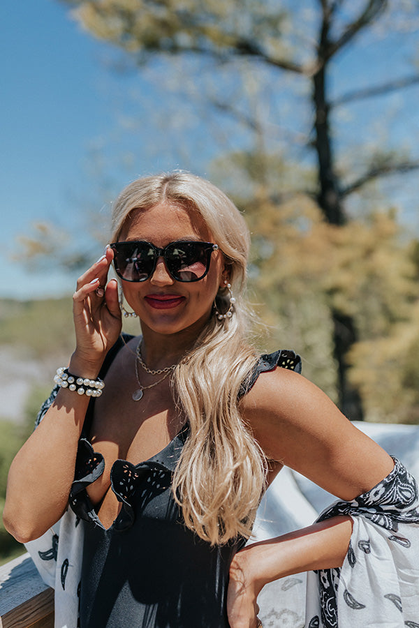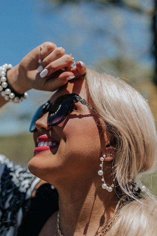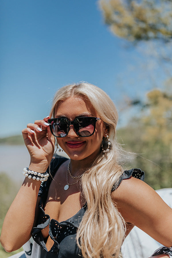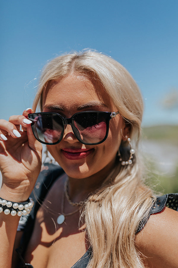 You are sure to have a major style moment when you complete your look with these luxe sunnies featuring oversized black frames with gold detail ear pieces and dark tinted lenses!