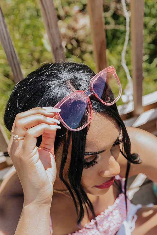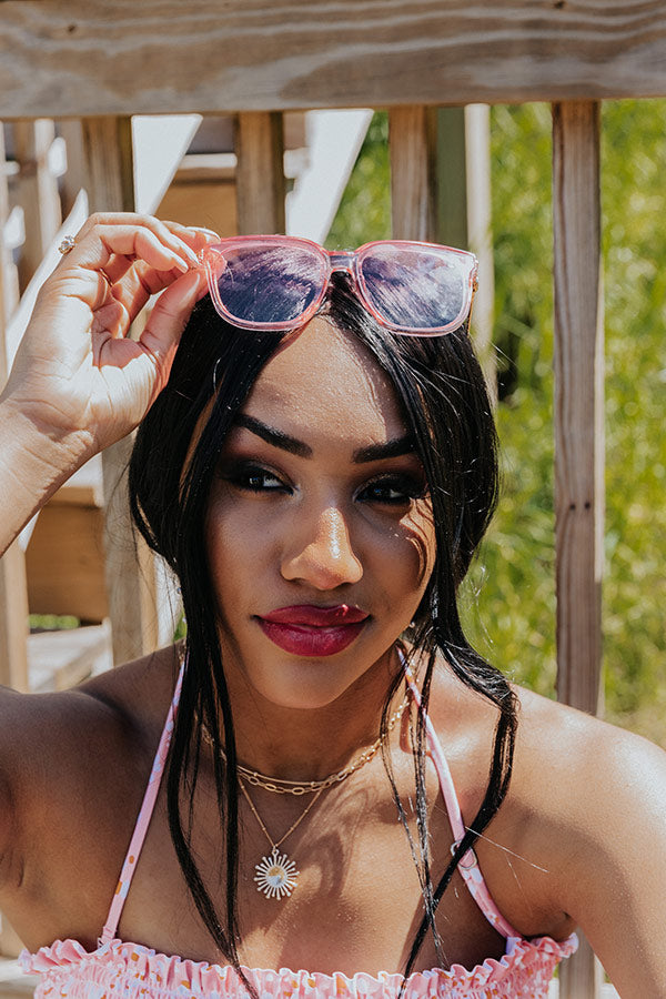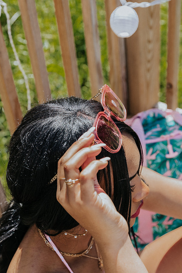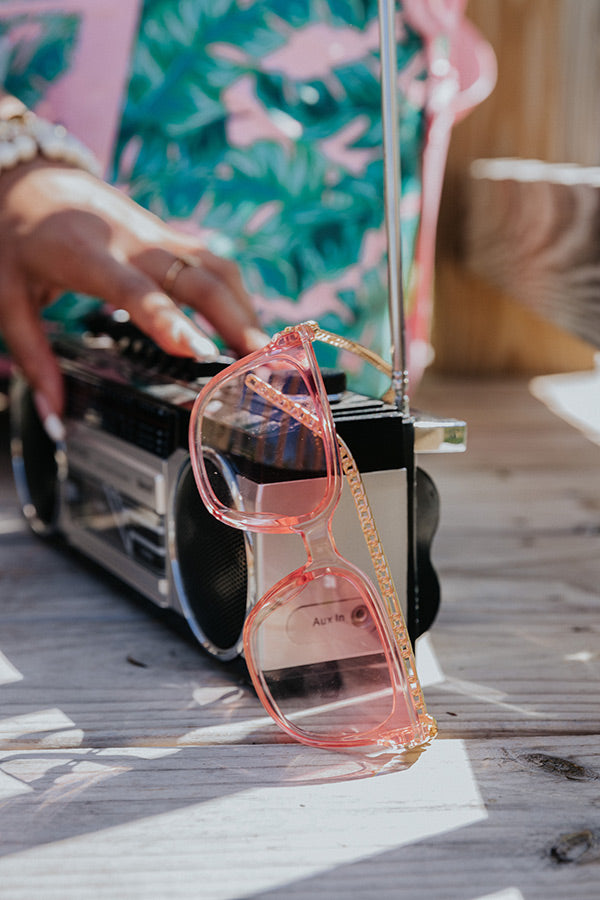 You are sure to have a major style moment when you complete your look with these luxe sunnies featuring oversized pink frames with gold detail ear pieces!