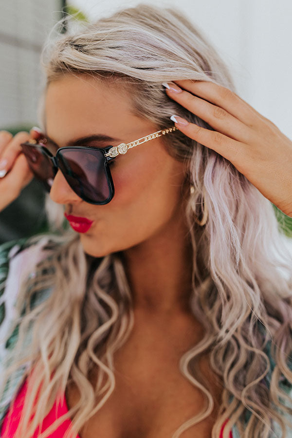 You are sure to have a major style moment when you complete your look with these luxe sunnies featuring oversized black frames with gold detail ear pieces and dark purple tinted lenses!