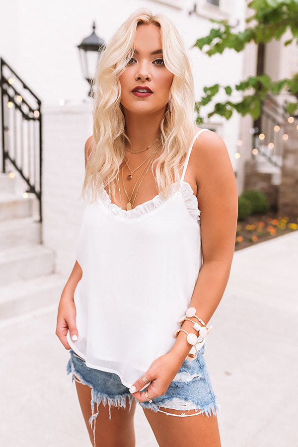 Our darling white "Veranda Views Shift Tank" is the upgrade your wardrobe basics have been asking for with its lightweight material, v-cut neckline with ruffled trim detailing, adjustable spaghetti straps with a low back, and a relaxed silhouette that falls into a rounded hemline! We have layered this casual cutie under a floral blazer with some distressed denim shorts, a statement belt, and a white bootie and bucket bag, but you can also wear it with some black satin joggers, the "Steve Madden Philip Leopard Sneaker," and our "Leopard Forever Headband!" Measurements