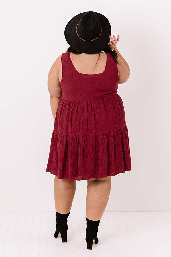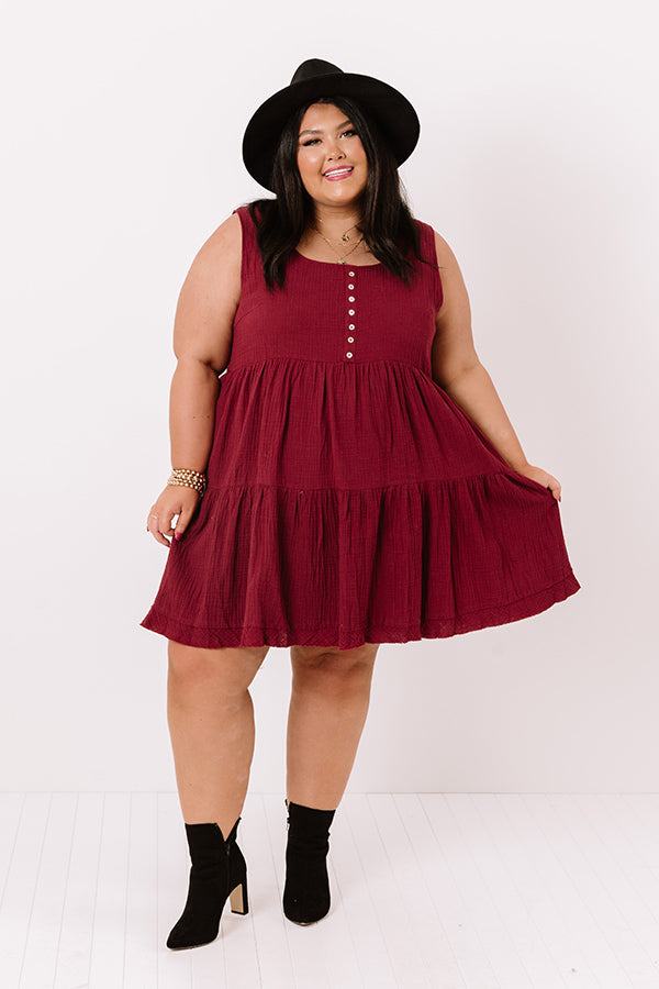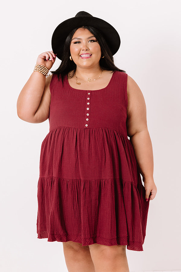 Plus Size - Our stunning wine colored "Vermont Views" dress features lightweight material, a button up bodice with a scooped neckline and upper back, wide 3-inch sleeveless shoulder straps, and a relaxed tiered babydoll silhouette that falls into an uneven mid-thigh length hemline!