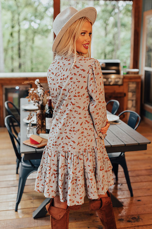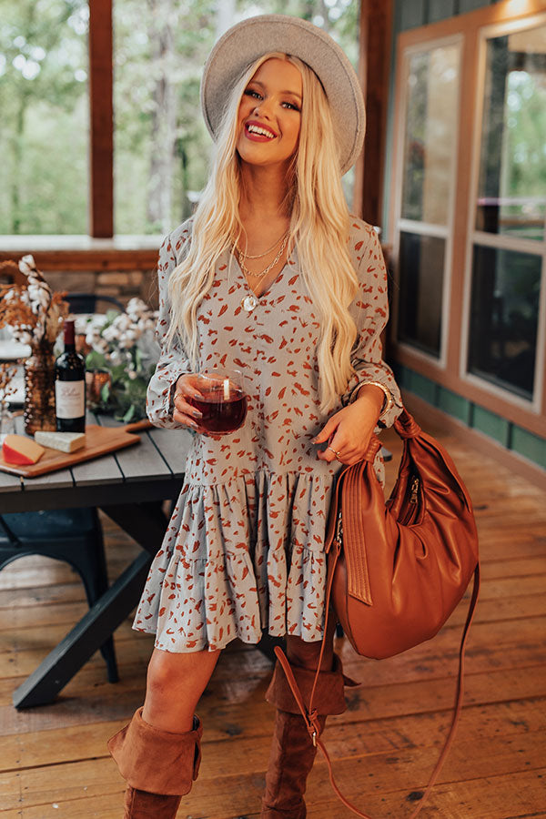 Twirl though fall in style with our darling airy blue colored "Vermont Visit Shift Dress" featuring lightweight flowy material patterned with a bold brown abstract spotted print, a button up bodice with a v-cut neckline, long loose bubble sleeves with fitted button closure cuffs, and a relaxed silhouette that falls into a tiered peplum bottom with an uneven mid-thigh length hemline! Measurements