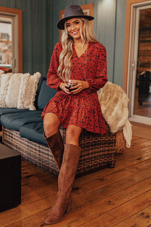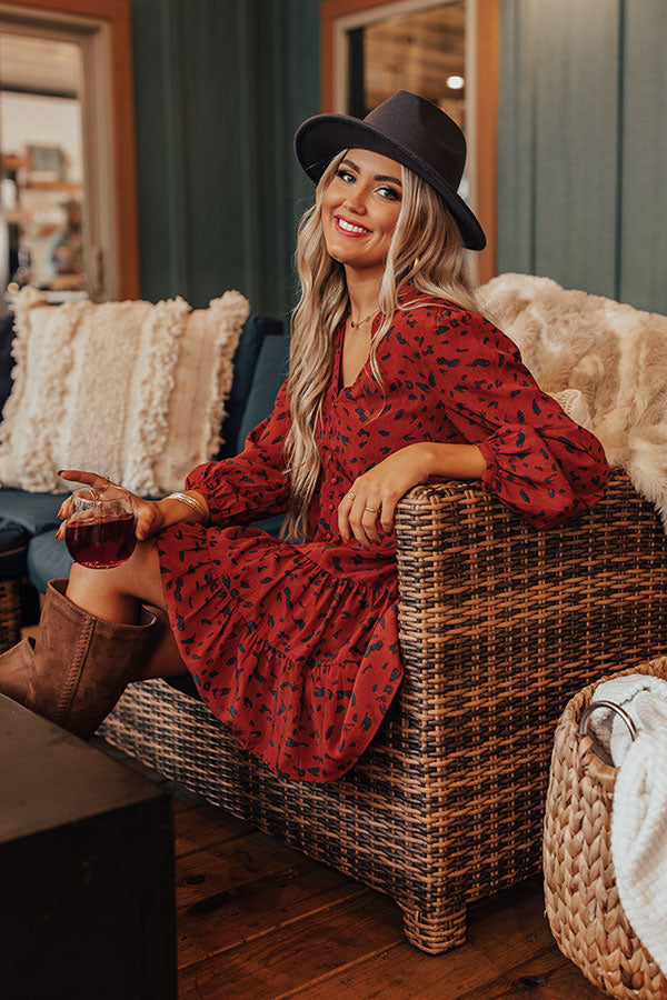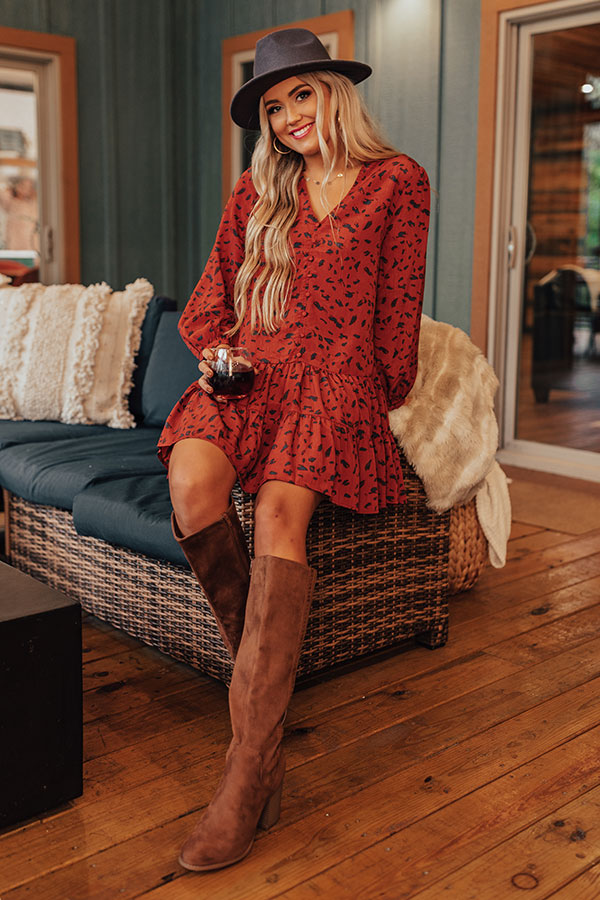 Twirl though fall in style with our darling rust colored "Vermont Visit Shift Dress" featuring lightweight flowy material patterned with a bold navy abstract spotted print, a button up bodice with a v-cut neckline, long loose bubble sleeves with fitted button closure cuffs, and a relaxed silhouette that falls into a tiered peplum bottom with an uneven mid-thigh length hemline! Measurements