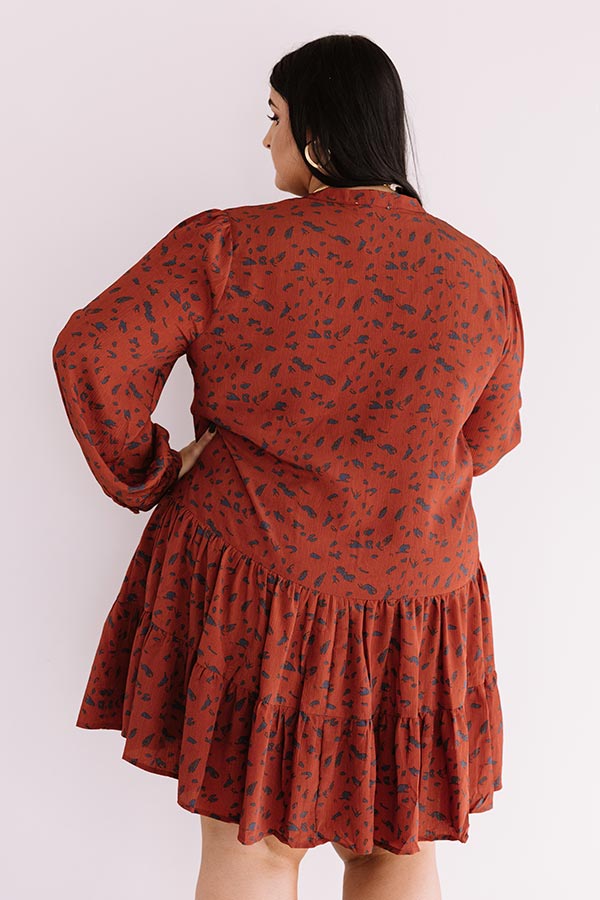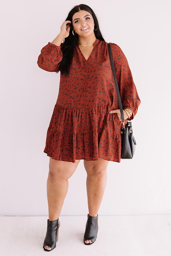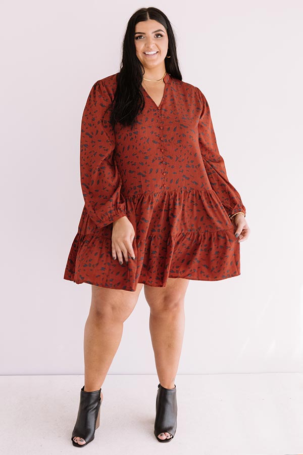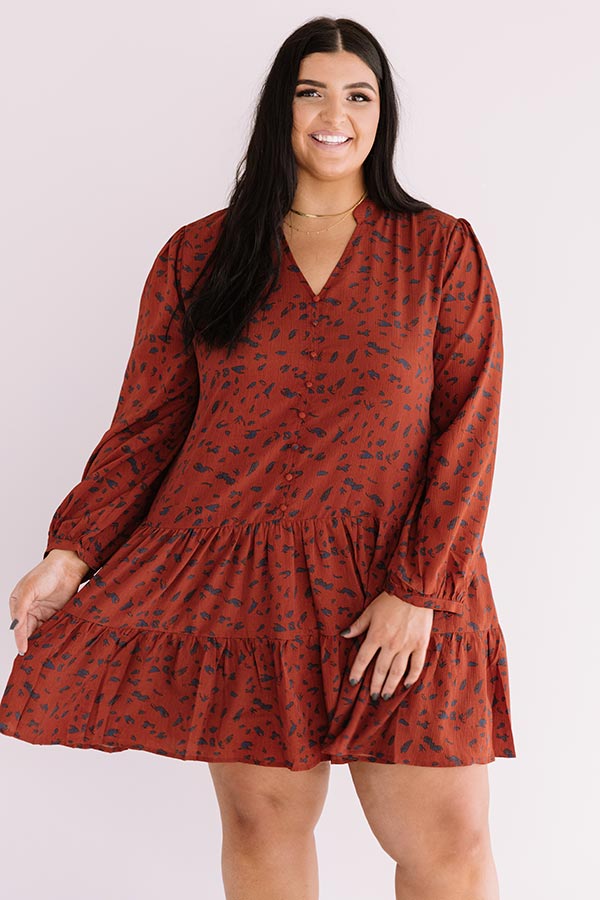 Plus Size - Twirl though fall in style with our darling rust colored "Vermont Visit Shift Dress" featuring lightweight flowy material patterned with a bold navy abstract spotted print, a button up bodice with a v-cut neckline, long loose bubble sleeves with fitted button closure cuffs, and a relaxed silhouette that falls into a tiered peplum bottom with an uneven mid-thigh length hemline!