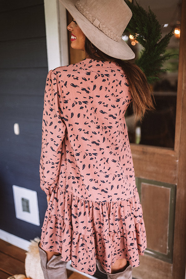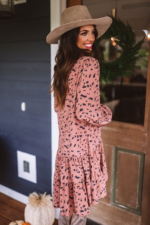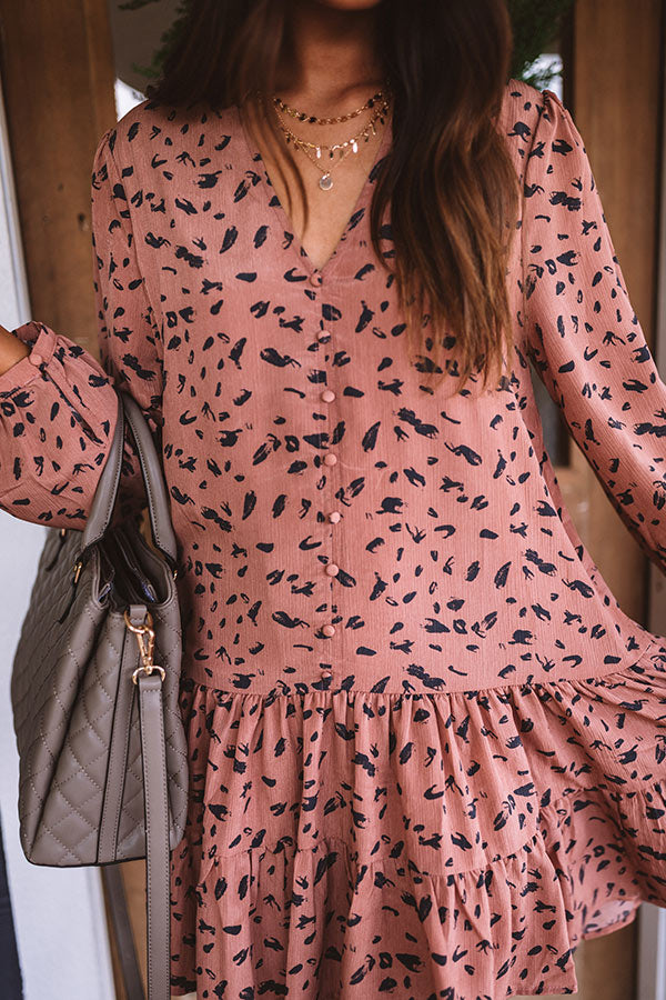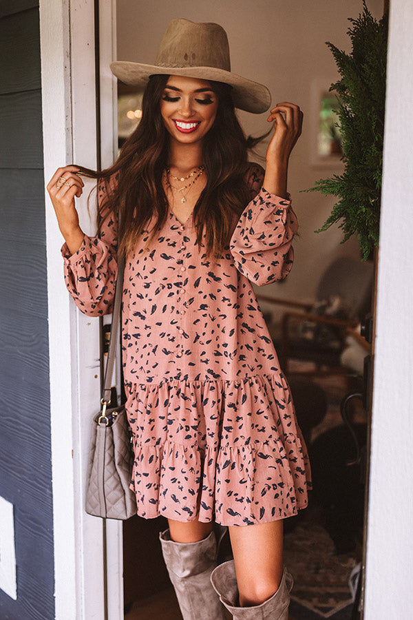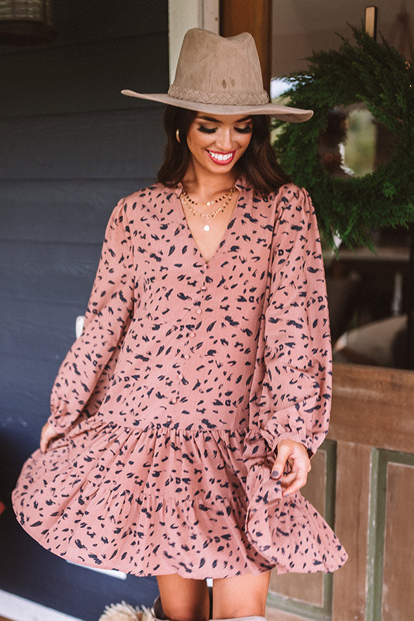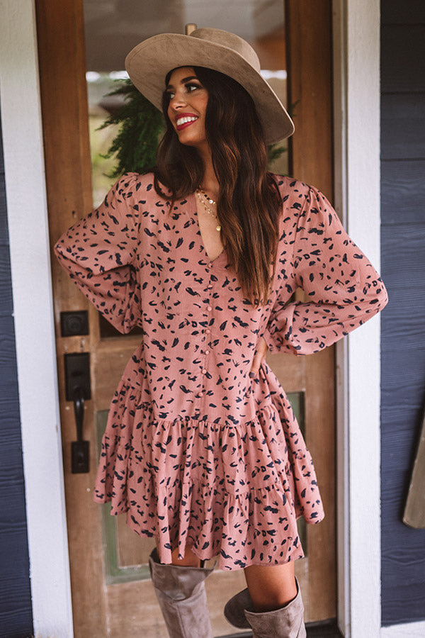 Twirl though fall in style with our darling rustic rose colored "Vermont Visit Shift Dress" featuring lightweight flowy material patterned with a bold black abstract spotted print, a button up bodice with a v-cut neckline, long loose bubble sleeves with fitted button closure cuffs, and a relaxed silhouette that falls into a tiered peplum bottom with an uneven mid-thigh length hemline! Measurements