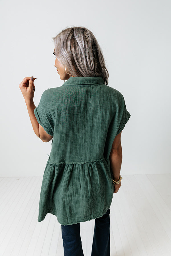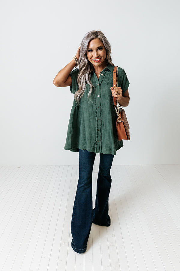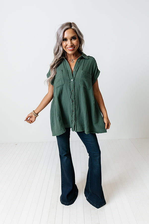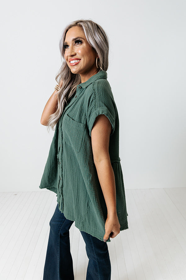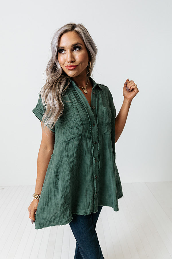 May all your fall wardrobe wishes come true with this charming hunter green hued shift top featuring lightweight flowy material with linen-like texturing, a button down front with a collared v-cut neckline, short sleeves with rolled cuffs, two accent chest pockets, and a relaxed silhouette that falls into a straight raw-cut hemline! Measurements