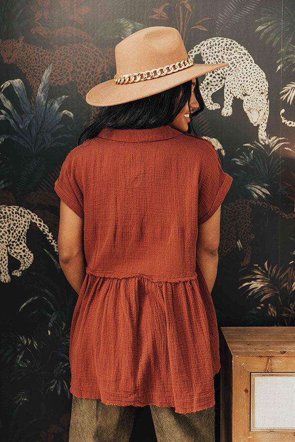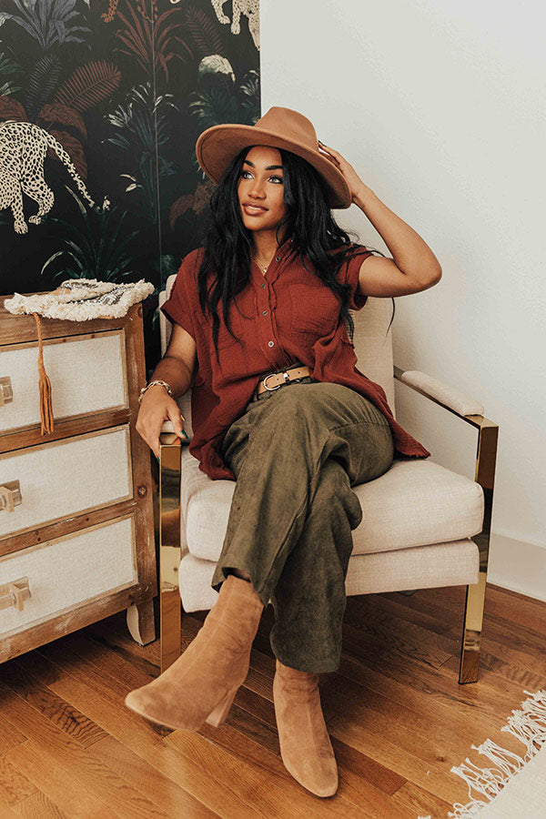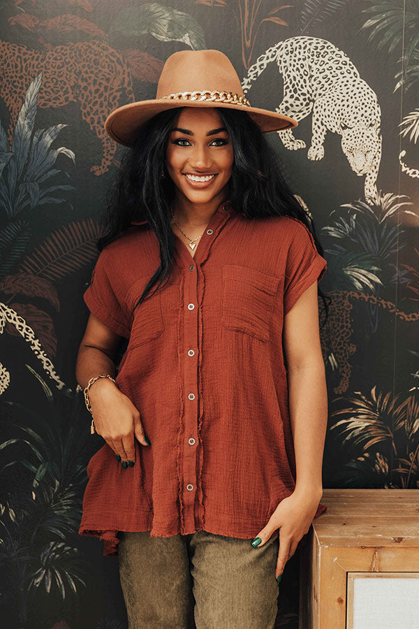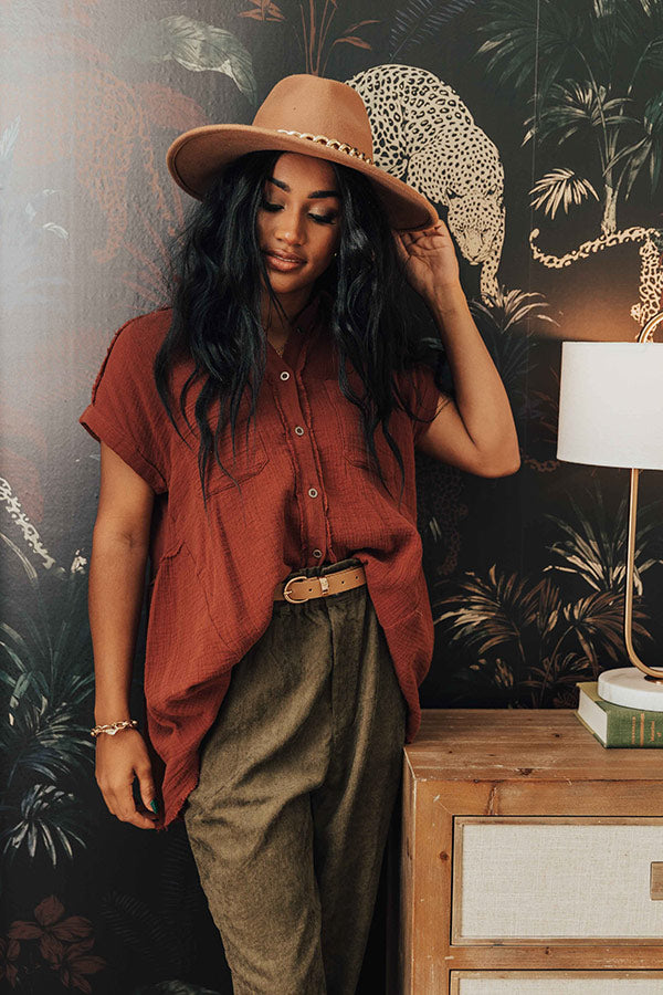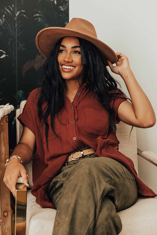 May all your fall wardrobe wishes come true with this charming wine hued shift top featuring lightweight flowy material with linen-like texturing, a button down front with a collared v-cut neckline, short sleeves with rolled cuffs, two accent chest pockets, and a relaxed silhouette that falls into a straight raw-cut hemline!